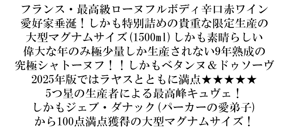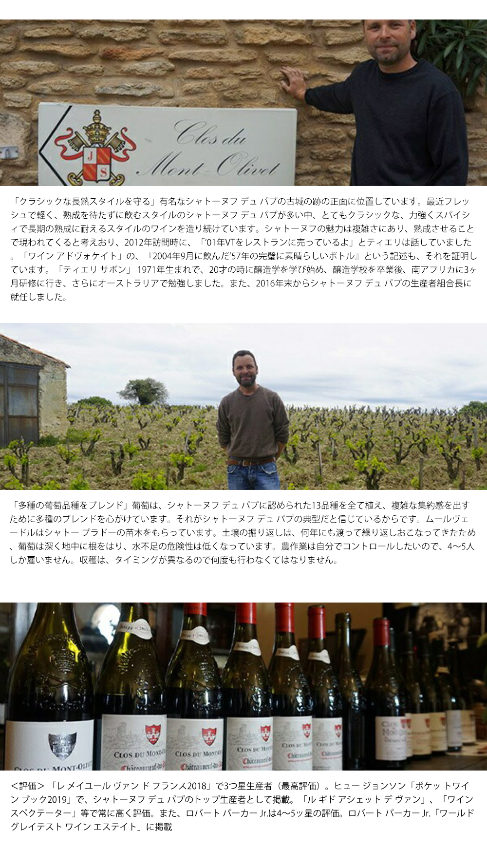 【商品説明】超入手困難!大型ボトル!フランス・最高級ローヌフルボディ辛口赤ワイン愛好家垂涎!素晴らしいスーパーグレイトヴィンテージのみ極少量しか生産されない究極シャトーヌフ!しかも特別詰めの貴重な限定生産の大型マグナムサイズ(1500ml)!しかもワインアドヴォケイト誌がシャトーヌフに驚異の98点を付けるスーパーグレイトヴィンテージ[2016]年もの!造り手はトップクラスのシャトーヌフで有名な銘醸ドメーヌ・クロ・デュ・モン・オリヴェ(ジョセフ・サボン家)(ベタンヌ&ドゥソーヴ2025年版ではラヤスとともに満点★★★★★5つ星&「メイユール ヴァン ド フランス 2025年版でも満点★★★3つ星」を獲得!)(シャトーヌフの名門であり現地評価誌であのラヤスと同格の3つ星生産者評価を獲得するクロ・デュ・モン・オリヴェ!)による、しかもRパーカーの愛弟子でWA・ワインアドヴォケイト誌のローヌ・カリフォルニア南部担当だったジェブ・ダナック(JebDunnuck.com)がこのワインに驚異の100点満点で絶賛!絶賛コメントは『ジェブダナック驚異100点満点獲得!大絶賛コメントは『ティエリー・サボンの2016年シャトーヌフ・デュ・パプ、ラ・キュヴェ・デュ・パペは、グラスの中で純粋に完璧だ。クラシック・キュヴェよりも力強く、キラー・ブラック・ラズベリー、砕けた岩、ガリーグ、塩辛いミネラル、ヨードが感じられ、深く、フルボディで、凝縮感があり、セクシーでありながら、タンニンがしっかりと感じられる。ベルベットの手袋をはめた鉄拳」のようなワインで、グラスに戻るたびに深みと豊かさが増していく。昔ながらの伝統的なシャトーヌフ・デュ・パプは、これ以上良いものはない。4~5年(もしくはそれ以上)ボトルを隠し、ラッキーだと思い、その後2~30年かけてボトルを楽しもう。クロ・デュ・モン=オリヴェのドメーヌは、超伝統的で熟成に値するシャトーヌフ・デュ・パプの紛れもない基準点である。このドメーヌは2001年以来ティエリー・サボンの手中にあるが、一族の歴史は1932年まで遡る。彼らは3つのシャトーヌフ・デュ・パプ、伝統的なキュヴェである若木のル・プティ・モン(ここではレビューしていない)、そしてフラッグシップのラ・キュヴェ・デュ・パペを生産している。どちらのキュヴェも驚くほど熟成に適したワインで、キュヴェ・デュ・パペは特に熟成のために造られ、樹齢が高く、除梗せず、すべてフードルで熟成させる。2016年のシャトーヌフ・デュ・パプ、ラ・キュヴェ・デュ・パペは、私がこれまでこのドメーヌで味わったワインの中で疑いなく最も偉大なワインであり、伝説的なワインに仕上がっている。お見逃しなく!100点満点』と大注目!さらにフランス権威評価誌「レ・メイユール・ヴァン・ド・フランス 2019」でほぼ満点の19/20点獲得!★「ルヴュ・ド・ヴァン・ド・フランス623」でもほぼ満点の19/20点獲得!「ベタンヌ&ドゥソーヴ2019」でもほぼ満点の19/20点獲得!★「ワインアドヴォケイト誌#238」でも驚異の94点の高評価!絶賛コメントは『2016 Chateauneuf du Pape La Cuvee du Papetはグルナッシュ90%とシラー10%のブレンドで、グルナッシュの多くは樹齢100年以上。濃厚でプラムのようだが、魅力的な花の香りがまだ残っている。フルボディでクリーミーなテクスチャーとふくよかさがあり、重みがありリッチで、フィニッシュは素晴らしくリッチで余韻が長い。アルコール度数は15.8%にもかかわらず、味わいに熱さはない。飲み頃、今~2035年 94点』と大注目!「ヴィノス2018.7」でも95点で絶賛!樹齢の非常に古い葡萄樹の葡萄(ほとんどが100年樹齢のグルナッシュ種)を使用!大樽でじっくり熟成させた、クロ・デュ・モン・オリヴェの超スペシャル キュヴェ!素晴らしいヴィンテージのみに生産され、納得がいかず生産されないヴィンテージはスタンダードのシャトーヌフ・デュ・パプに格下げしてブレンドしてしまうこだわり究極シャトーヌフ!平均樹齢90~100年!大樽(普通は集約感を出すため全て大樽を使いますが、より純粋な果実味を残したいと考え、50%にタンクを使いました)で18ヶ月熟成!造り手は、トップクラスのシャトーヌフを産出することで有名なクロ・デュ・モン・オリヴェの元詰もの!しかもクロ・デュ・モン・オリヴェがグレイトヴィンテージの時のみ生産する超スペシャル・キュヴェ!まさにベスト・オブ・ベストというべきキュヴェで、このスーパーグレイトヴィンテージ2016年のキュヴェ・デュ・パペはモン・オリヴェとボワ・ドーファンという名高い畑に植えられた最も樹齢の高い葡萄(100年樹齢)のグルナッシュ90%にシラー10%を50%をタンクで、残りは大樽50%で18ヶ月熟成!「シャトーヌフ・デュ・パプについてはいつも『開けるのは辛抱強く待って』と伝えているが、このヴィンテージだけは自分でもあけるのをしばらく待つのが難しいほど、素晴らしく魅力的なヴィンテージとなったとオーナー自ら絶賛!アルコール度数15.5%以上というこの2016年はまさに素晴らしいアロマティックなブ