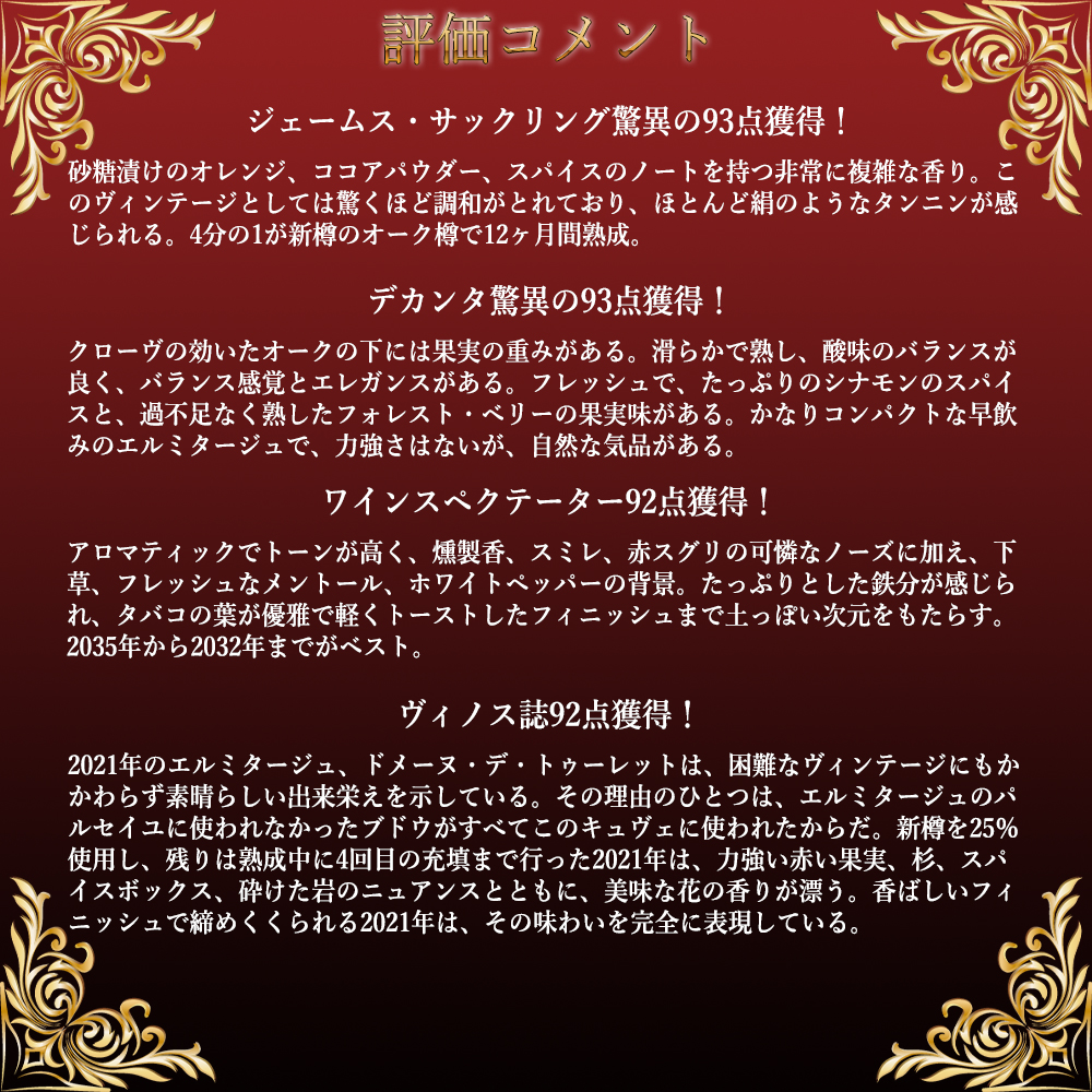 【商品名】エルミタージュ・ドメーヌ・デ・トゥレット・ルージュ[2021]年・ドゥラス社・AOCエルミタージュ・正規品・ジャームス・サックリング93点&デカンタ93点&ワインスペクテーター92点&ヴィノス92点
