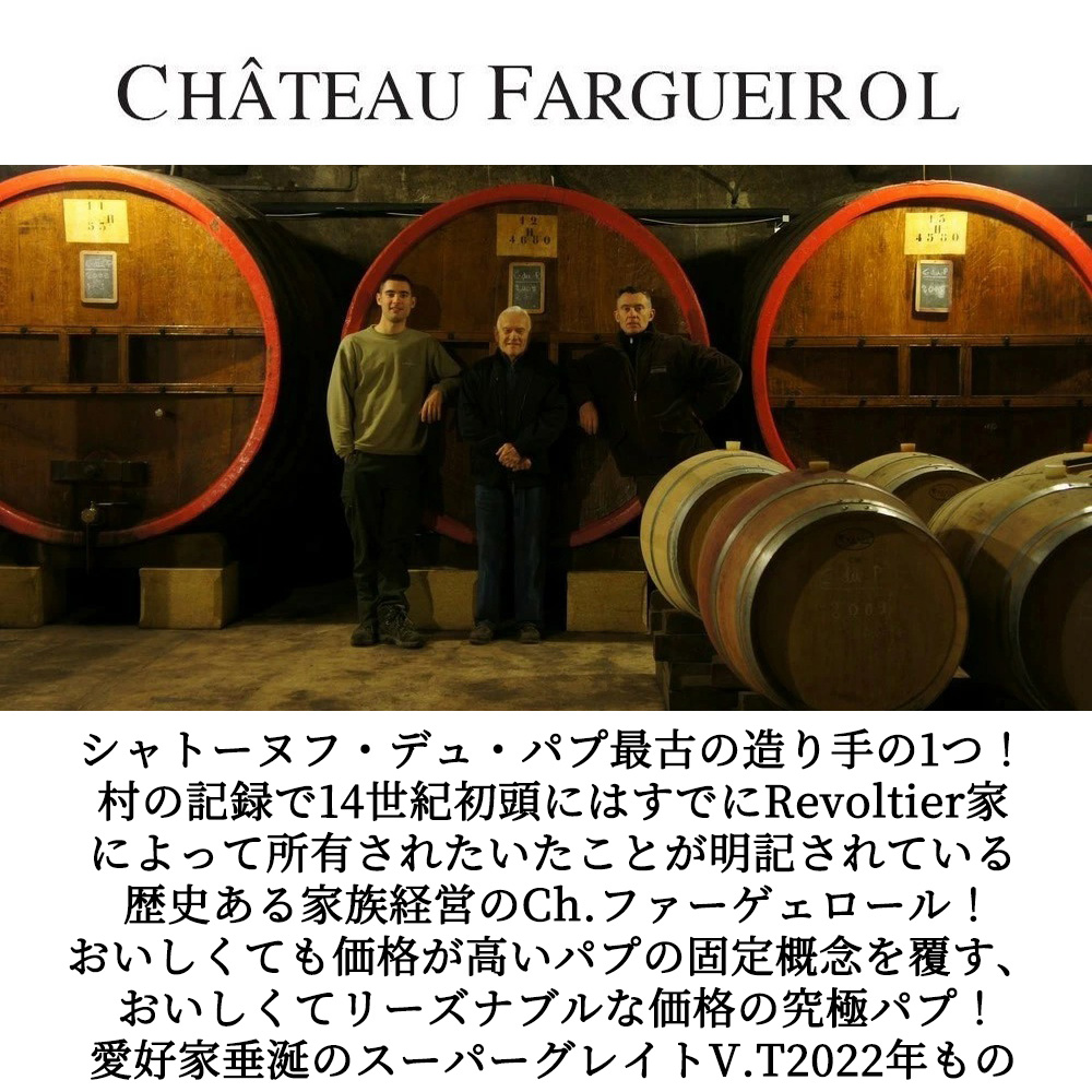【商品説明】フランス高級ローヌ辛口赤ワイン愛好家大注目!シャトーヌフ・フルボディ辛口赤ワインファン感涙!しかもワインアドヴォケイト誌がシャトーヌフに驚異の96点をつけるスーパーグレイトヴィンテージ[2022]年もの! しかも造り手は、シャトーヌフ・デュ・パプ最古の造り手のひとつ!村の記録によると14世紀初頭にはアヴィニョン大司教管轄下においてRevoltier家によって所有されたいたことが明記されている!フランス革命時にシャトー・ファーゲェロールを残してその地を離れ、Courthezonへ移り住みました!その後、一族がその地に戻り、1974年、Joseph Revoltierは10haのシャトー周辺の葡萄畑を購入し、ワイン造りをスタート!ジョゼフはその後も息子ピエール、孫のロマンと共に情熱を持ってドメーヌの発展に尽力し、今日では30haにも及ぶ広大なブドウ畑を所有するまでに成長!彼らはシャトーヌフ・デュ・パプのアぺラシオンで許可されている13種のブドウを栽培し、独特のテロワールの個性を表現しています! ずばりシャトー・ファーゲェロールの究極シャトーヌフ・デュ・パプ!平均樹齢30年のグルナッシュ60%、シラー15%、ムールヴェードル15%、サンソー10%を全体の50%をオークタンクで9ヵ月熟成!残りの50%を1-2年使用のフレンチオーク樽で9ヵ月熟成で造られる究極フルボディ辛口赤ワイン! この[2022]年でジルベール&ガイヤール驚異の92点高評価でコメントは「深いガーネット色に若々しい輝き。黒いストーンフルーツ、スパイス、スモーキーさ、ガリグの香りが生き生きとしたアロマを作り上げている。フルボディでチッチ、男らしさのある味わいには程よいフレッシュさが躍動感を与える。地中海の若々しい香りが、本当に素晴らしい仕上がりだ。」と大絶賛! 輸入元のバイヤーさんも「黒果実にスミレ、ハーブ、またカラメルのような芳ばしい甘やかさも加わり心地よい香りがいっぱいに広がる!タンニン、アルコールのボリュームは当然あるが、それに負けない果実の旨味がしっかりあるので、強い系としてバランスが取れている。価格もお値打ちだし、評価も得ており、おすすめ間違いなしの1本」と太鼓判! インポーターさんのテイスティングコメントは「ガーネットがかった深いルビー色。若々しくも落ち着いた輝きがあり、凝縮感とエレガンスを感じさせる色調。ブラックチェリーや完熟プラム、ブラックベリーといった黒系果実のアロマに、黒コショウや甘やかなスパイス、ほのかなスモーク香が重なり、さらに地中海沿岸を思わせるガリグ (タイム、ローズマリー、ラベンダーなどの低木) のニュアンスが複雑味を与える。時間の経過とともに、カカオやリコリス、黒トリュフのような深みのある香りも顔を覗かせる。骨格のしっかりしたフルボディ。グルナッシュ由来の豊かな果実味と、シラーやムールヴェードルの構造的なタンニン、そして清涼感のある酸が見事に調和しており、味わいは力強くも滑らか。ミネラル感とともに、カシスリキュールや煮詰めた黒果実の風味が余韻まで持続し、飲み応えがありながらも飲み疲れない仕上がり。」と大注目! よく熟した赤果実に黒トリュフやココアなどのゴージャスな香りの要素も十分にあり、リッチで豊かな味わいと長く洗練された余韻を備えています!おいしくても価格が高いパプの固定概念を覆す、おいしくてリーズナブルな価格の究極シャトーヌフ・デュ・パプをぜひお試しください!待望の最新ヴィンテージでスーパーグレイトヴィンテージ[2022]年もので遂に登場!
