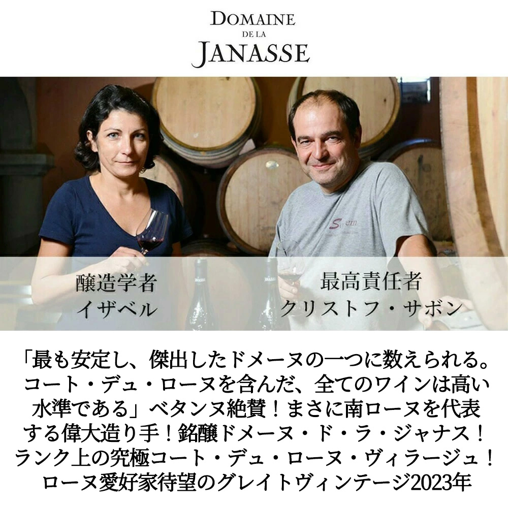 【商品説明】超入手困難!完全割り当ての希少アイテム!高級ローヌ辛口赤ワイン愛好家大注目!シャトーヌフファン大注目!しかもグレイトヴィンテージ[2023]年もの (品質・収量ともに良好で、果実味豊かでジューシー、魅力的。タンニンは柔らかく、アルコール抑制。バランスとエネルギーが感じられると評される大人気ヴィンテージ) が待望入荷! 銘醸ドメーヌ・ド・ラ・ジャナスが唯一、厳選グルナッシュ25%、シラー25%、ムールヴェードル25%、カリニャン25%で造られる、味わいもシャトーヌフと同等の味わいで、AOCコート・デュ・ローヌで最もコストパフォーマンスが高い傑作フルボディ辛口赤!コート・デュ・ローヌ・ヴィラージュについてワインライターは「ローヌ南部産のワイン。特に申し分ない16の村は名前をラベルに記すことができる。がっしりして大抵は信頼がおける。時に極めて見事なものも。赤はグルナッシュがベースだが、現在はシラーやムールヴェードルの割合が増えている。」として大注目! 造り手は南ローヌを代表する偉大な造り手!ロバート・パーカー氏に満点5つ星★★★★★生産者に挙げさせ、「ほぼ全てのワインが申し分なく高品質」と言わしめ、ベタンヌ&ドゥソーヴには★★★3B&Dマークで「最も安定し、傑出したドメーヌの一つに数えられる。コート・デュ・ローヌを含んだ、全てのワインは高い水準である」と大絶賛!ゴーミヨ誌では、6つ星生産者に挙げ絶賛!の究極ドメーヌ!から、ランク上の究極コート・デュ・ローヌ・ヴィラージュ“テール・ダルジール”! キュヴェ名のテール・ダルジールは土壌の特徴の“粘土”に由来!シャトーヌフ・デュ・パプのアペラシオンから東へ目と鼻の先にあるクルテゾンの町の北側に位置する良質の赤粘土と小石混じりの土壌の区画からの厳選グルナッシュ25%、シラー25%、ムールヴェードル25%、カリニャン25%使用!シラー、ムールヴェードル、カリニャンは新樽 (1/3) で、グルナッシュはフードル (大樽) で12ヶ月熟成!平均収量40hl/ha! この2023年でジェームス・サックリング驚異の91点でコメントは「濃厚な黒果実の香りにタールと生肉のニュアンスが絡み、力強く非常にフルボディなワインへと誘う。大胆な存在感を放つが、これはワイドスクリーンな南ローヌだ。15.5%のアルコールによるほのかな温かみが余韻に残るため、温度が高くなりすぎないように。粘土質の土壌で育ったグルナッシュ、シラー、ムールヴェードル。」と大注目! 味わいもシャトーヌフ同様の味わで、粘性の高い甘みと濃縮感を備えながらも、エレガントさも兼ね備えています!ブラックルビーカラーで、カシス、ブラックベリー、ブラックチェリー、リコリス、炭等の複雑で豊かな香りと、落ち着いた上質な酸!深みがあり、チョコレートや香辛料の要素もあり、さらに奥深さを備えています!素晴らしい品質の高級コート・デュ・ローヌ・ヴィラージュ!究極フルボディ赤ワインがグレイトヴィンテージ[2023]年で極少量入荷!