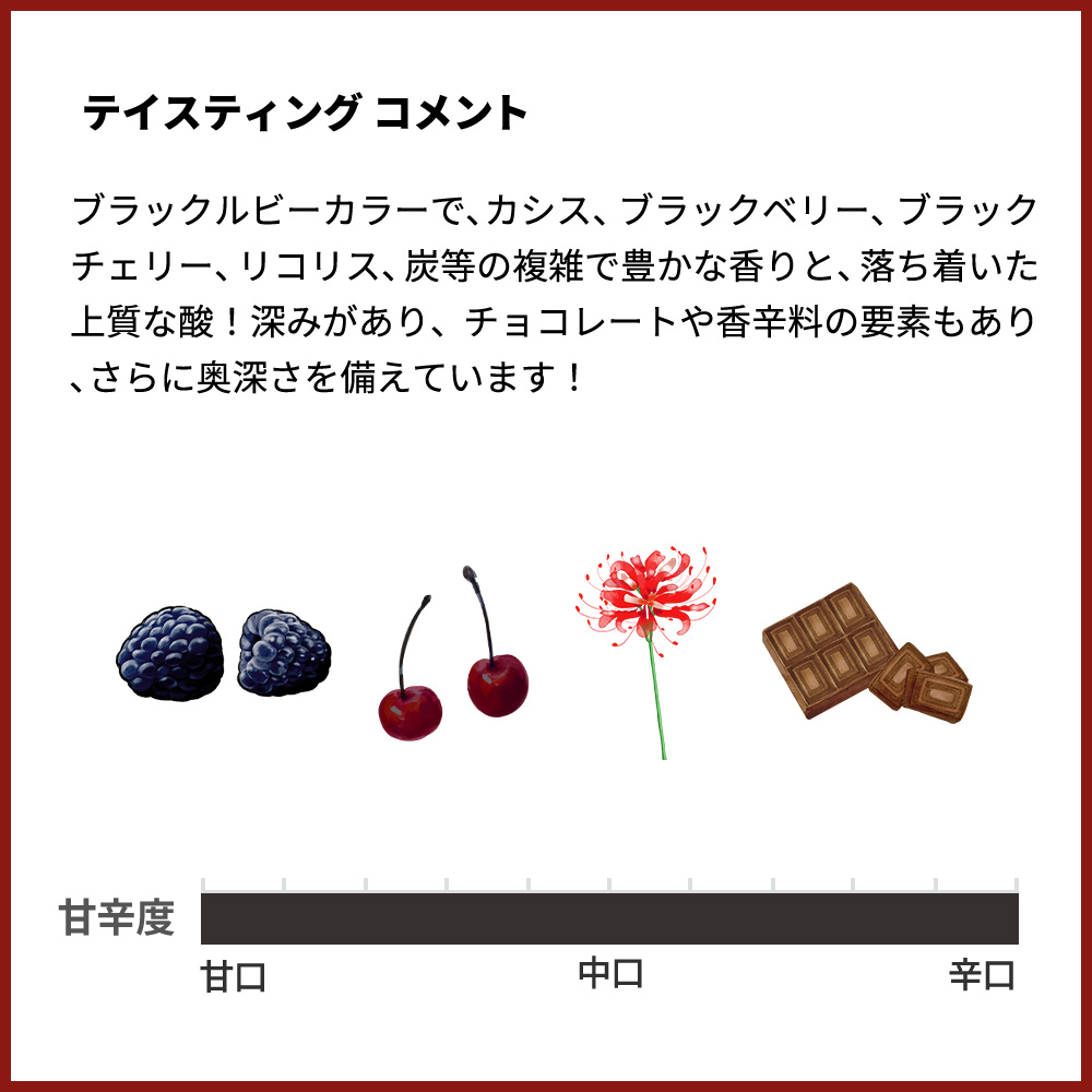 【ブドウの品種】グルナッシュ25%、シラー25%、ムールヴェードル25%、カリニャン25%