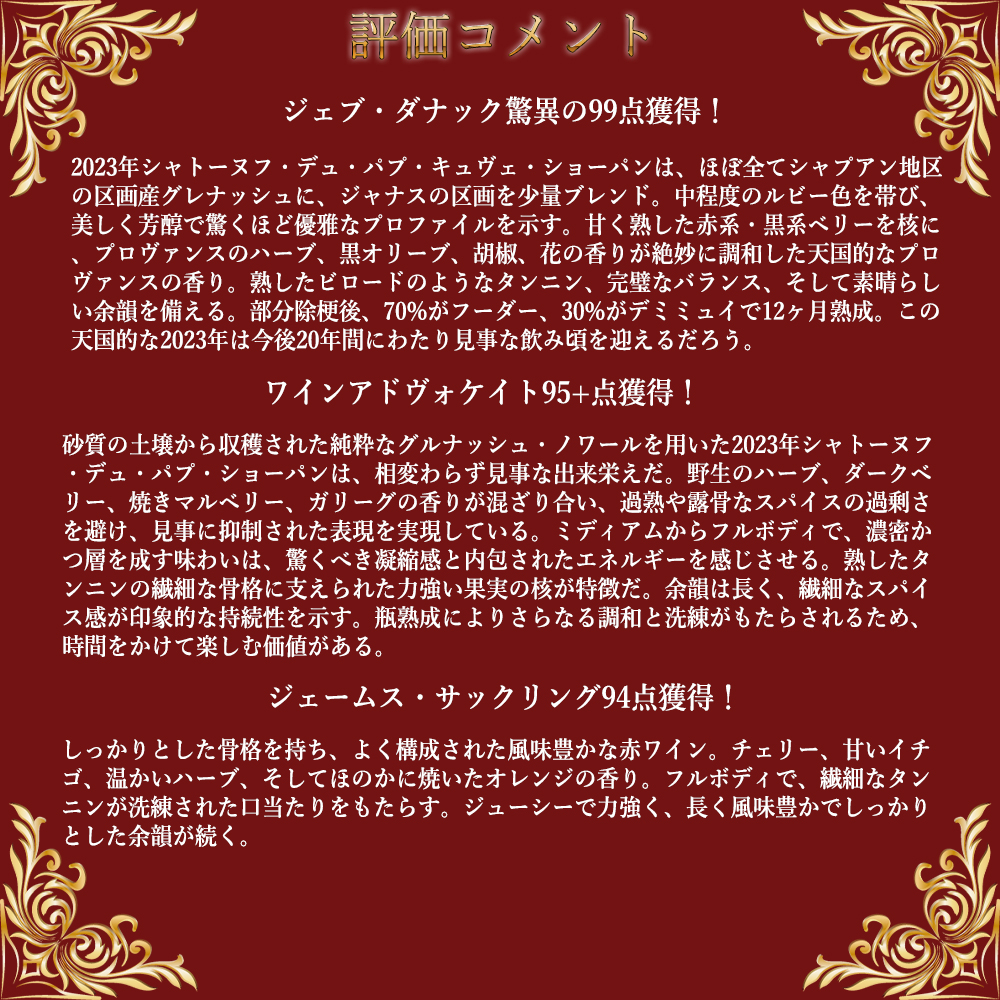 シャトーヌフ デュ パプ キュヴェ ショーパン 2023 蔵出し ドメーヌ ド ラ ジャナス元詰 15.5% JD99点&WA95+点&JS94点 Chateauneuf du Pape Cuvee Chaupin 2023 Domaine