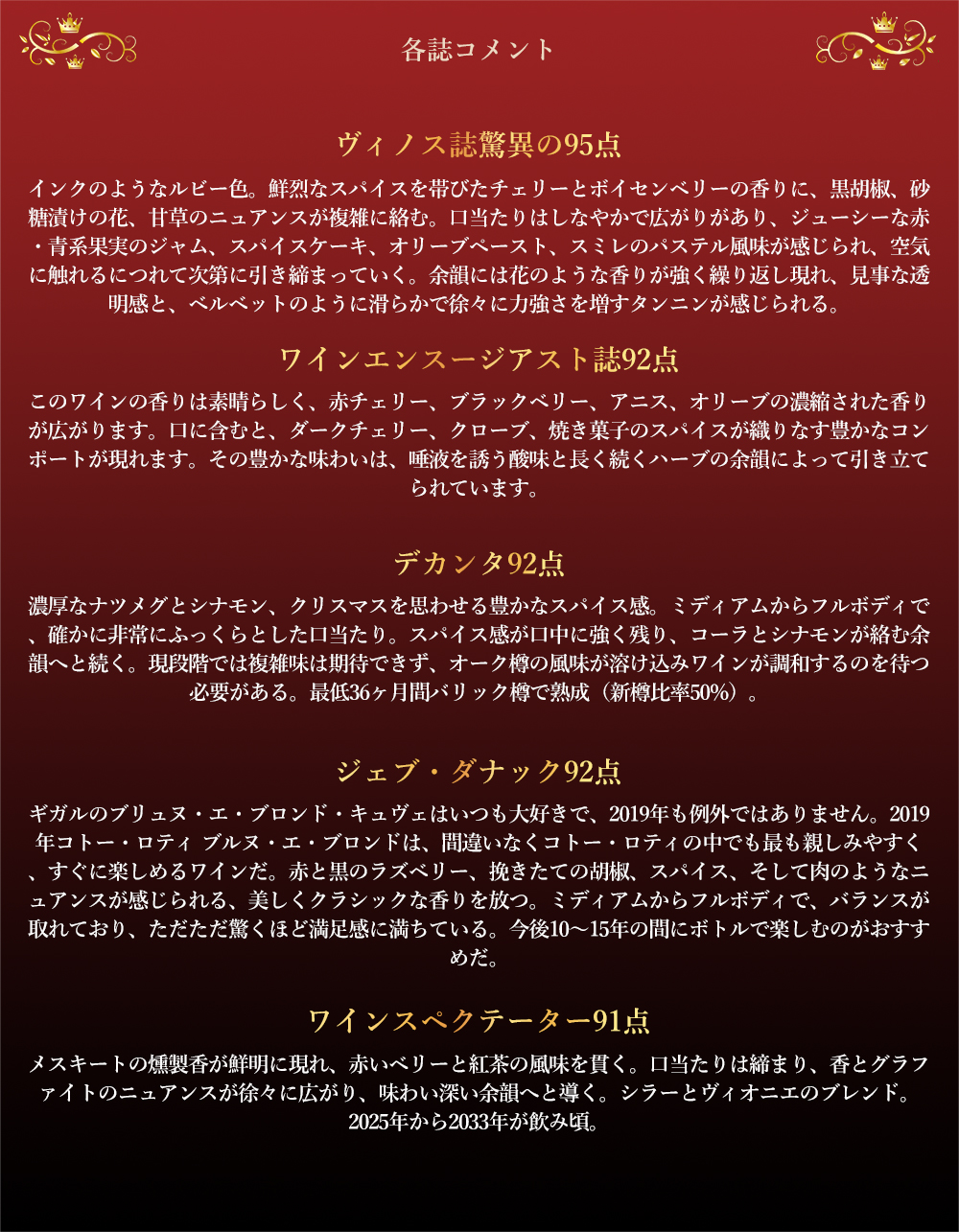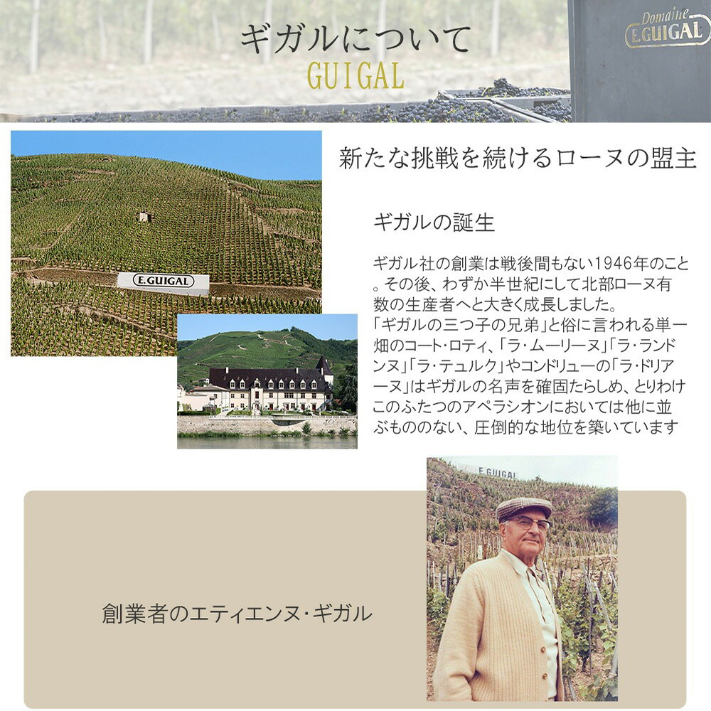 【商品説明】フランス高級ローヌ・フルボディ辛口赤ワイン愛好家大注目!高級シラー種100%辛口赤ワインファン大注目!ローヌで最も上質な赤ワインとして有名!年とともに (5~10年もしくはそれ以上) アロマに富み、花のかぐわしさや繊細さが加わり最高の状態に!なると言われる究極赤ワインAOCコート・ロティ! しかもスーパーグレイトヴィンテージ[2019]年もの (アシェットガイド誌2023年版ではコート・ロティに18/20点のスーパーグレイトヴィンテージ評価)!あのロバート・パーカー氏に「私にとって最も気分を高揚させる瞬間は、マルゴーやペトリュスではなく、熟成した最良のコート・ロティかエルミタージュのグラスを前にする時である。」と絶賛させたコート・ロティ!ヒュー・ジョンソン氏も、コート・ロティについて「ローヌ河流域で最も上質でブルゴーニュ的な赤。年とともに (5~10年) (もしくはそれ以上たって) 芳醇さ、やわらかさ、繊細さが加わり、様々な要素がうまく組み合わさったものとなる。」★★★~★★★★4つ星と最高評価! しかも造り手は、コート・ロティの“極み”とも評される“ムーリーヌ”や“ラ・ランドンヌ”を生み出す、ローヌワインの代名詞とも言える“E.ギガル”による「コート・ブリュヌ (褐色の丘) 」と「コート・ブロンド (金色の丘) 」という名が付けられた人気キュヴェ!湿度管理調整可能なステンレスタンクで醸造!自動ピジャージュをしながら3週間の醸し醗酵!その後樽熟成驚異の36ヶ月 (新樽40%) で熟成で造られるフルボディ辛口赤ワイン! この2019年でヴィノス誌驚異の95点でコメントは『インクのようなルビー色。鮮烈なスパイスを帯びたチェリーとボイセンベリーの香りに、黒胡椒、砂糖漬けの花、甘草のニュアンスが複雑に絡む。口当たりはしなやかで広がりがあり、ジューシーな赤・青系果実のジャム、スパイスケーキ、オリーブペースト、スミレのパステル風味が感じられ、空気に触れるにつれて次第に引き締まっていく。余韻には花のような香りが強く繰り返し現れ、見事な透明感と、ベルベットのように滑らかで徐々に力強さを増すタンニンが感じられる。』! ワインエンスージアスト誌92点でコメントは『このワインの香りは素晴らしく、赤チェリー、ブラックベリー、アニス、オリーブの濃縮された香りが広がります。口に含むと、ダークチェリー、クローブ、焼き菓子のスパイスが織りなす豊かなコンポートが現れます。その豊かな味わいは、唾液を誘う酸味と長く続くハーブの余韻によって引き立てられています。』! デカンタ92点でコメントは『濃厚なナツメグとシナモン、クリスマスを思わせる豊かなスパイス感。ミディアムからフルボディで、確かに非常にふっくらとした口当たり。スパイス感が口中に強く残り、コーラとシナモンが絡む余韻へと続く。現段階では複雑味は期待できず、オーク樽の風味が溶け込みワインが調和するのを待つ必要がある。最低36ヶ月間バリック樽で熟成(新樽比率50%)。』! ジェブ・ダナック92点でコメントは『ギガルのブリュヌ・エ・ブロンド・キュヴェはいつも大好きで、2019年も例外ではありません。2019年コトー・ロティ ブルヌ・エ・ブロンドは、間違いなくコトー・ロティの中でも最も親しみやすく、すぐに楽しめるワインだ。赤と黒のラズベリー、挽きたての胡椒、スパイス、そして肉のようなニュアンスが感じられる、美しくクラシックな香りを放つ。ミディアムからフルボディで、バランスが取れており、ただただ驚くほど満足感に満ちている。今後10~15年の間にボトルで楽しむのがおすすめだ。』! ワインスペクテーター91点でコメントは『メスキートの燻製香が鮮明に現れ、赤いベリーと紅茶の風味を貫く。口当たりは締まり、香とグラファイトのニュアンスが徐々に広がり、味わい深い余韻へと導く。シラーとヴィオニエのブレンド。2025年から2033年が飲み頃。』! シラー主体にヴィオニエを加えたエレガントな高級辛口赤ワイン!熟したラズベリーやブラックベリー、黒コショウ、スモーク、バニラなど複雑な香りが広がり、味わいは中~フルボディで、果実味と滑らかなタンニンが調和しています!新樽熟成によりウッディな要素も加わり、洗練された仕上がり!若いうちから楽しめますが、10年以上の熟成も可能で、深みが増すポテンシャルを持ちます!銘醸Eギガルの大人気コート・ロティ“ブリュヌ・エ・ブロンド”がスーパーグレイトヴィンテージ[2019]年もので待望入荷!
