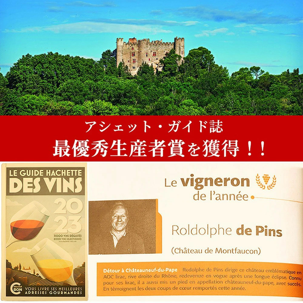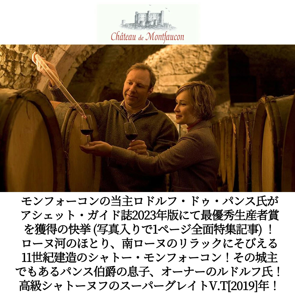 【商品説明】フランス高級ローヌ辛口赤ワイン愛好家大注目!シャトーヌフ・フルボディ辛口赤ワインファン感涙!ついに造り手のシャトー・ド・モンフォーコンの当主ロドルフ・ドゥ・パンスがフランスワイン権威評価誌『アシェット・ガイド誌2023年版』にて最優秀生産者賞を獲得の快挙! (写真入りで1ページ全面特集記事) !しかもフランスワイン評価本アシェット・ガイド誌2025年版でもシャトーヌフにスーパーグレイトヴィンテージ評価の偉大な[2019]年! (伝説のVTの1990年や1975年と同評価) (シャトーヌフにワインアドヴォケイト誌驚異の96点でExtraordinary. Still tannic, youthful or slow to matureの偉大なワインの長熟評価) のずばり絶対買いの南ローヌのスーパーグレイトヴィンテージで超限定少量入荷!しかも『アシェット・ガイド誌2023年版』ではこのシャトーヌフの2020年VTでクー・ド・クール (ハートに一撃) 獲得の快挙! 造り手のシャトー・ド・モンフォーコンは南ローヌのAOCリラックの中にそびえる11世紀建造のシャトー (お城) !その城主でもあるパンス伯爵の息子、オーナーのルドルフ (現在リラックAOPの代表) がオーナーです。彼はフランス国内やカルフォルニア大学デーヴィス校でワインを学び、バロッサのヘンチキやヌフドパプのヴューテレグラフで修業。1936年から途絶えていたシャトーでのワイン造りを見事に復活させました。初ヴィンテージは1995年で、以来、そのワインは高く評価され、毎年数々の栄誉を受けています。リラックのテロワールの可能性を信じる彼は、樹齢が高く最良の区画を探し求め、畑は現在60haまでに拡大。2016年からはACリラックの委員長を務めています! このスーパーグレイトヴィンテージのシャトー・ヌフ・デュ・パプ[2019]年は、シャトー・ヌフ・デュ・パプの有名な地区「ラ・クロー」に隣接する南斜面に位置する丸石で覆われた単一畑100%も土壌の小さな区画のブドウを使用 (2019年はグルナッシュ種驚異の92%&ムールヴェードル種8%を使用) しかも樹齢80年以上のグルナッシュが畑の大部分を占め、しかも低収量の35hl/ha以下で手摘み100%で収穫!すべて除梗後7日間の発酵!発酵終了後さらに8日間のマセラシオンを行う!12ヶ月樽熟成した後、コンクリートタンクでさらに8ヶ月熟成の合計20ヶ月熟成でリリース (2014年が初リリース) ! この2019年でワインアドヴォケイト驚異の93+点でコメントは『「古樽」で熟成されたにもかかわらず、2019年シャトーヌフ・デュ・パプは、バニラと杉の明確な香りを鼻に感じさせ、ハーブのニュアンスと熟したチェリーやベリーの豊かな香りが調和している。フルボディで濃縮感に富み、タンニンはしっかりしながらも熟成が進んだ、レ・エスコンドゥード産グルナッシュとムールヴェードルの92-8ブレンド。シルキーな余韻が長く続き、さらなる熟成の可能性を予感させる。』! ブラックベリーやブルーベリーのアロマは優しいスパイスと調和し複雑で繊細な口当たりは完熟果実のまろやかさときめ細やかなタンニンのエレガンスにあふれています!まさに古樹のグルナッシュならではのしなやかなフィネスを表現したシャトーヌフ・デュ・パプの偉大ヴィンテージ[2019]年が限定で蔵出し品で少量入荷!