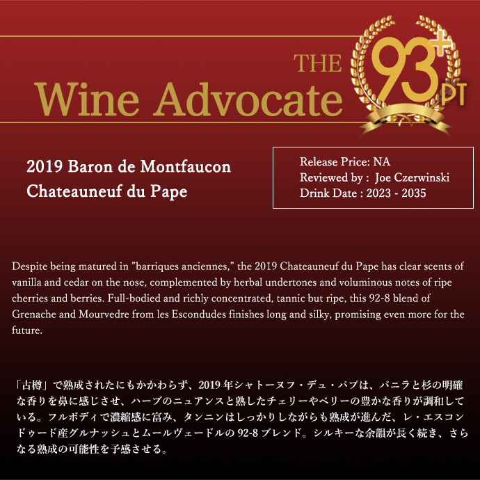 【商品名】シャトーヌフ・デュ・パプ[2019]年・バロン・ド・モンフォーコン(シャトー・ド・モンフォーコン)(当主ロドルフ・ドゥ・パンス家)・AOCシャトーヌフ・デュ・パプ・ワインアドヴォケイト驚異の93+点・7年熟成品【英名】Chateauneuf du Pape 2019 Baron de Monfaucon (Chateau de Montfaucon)