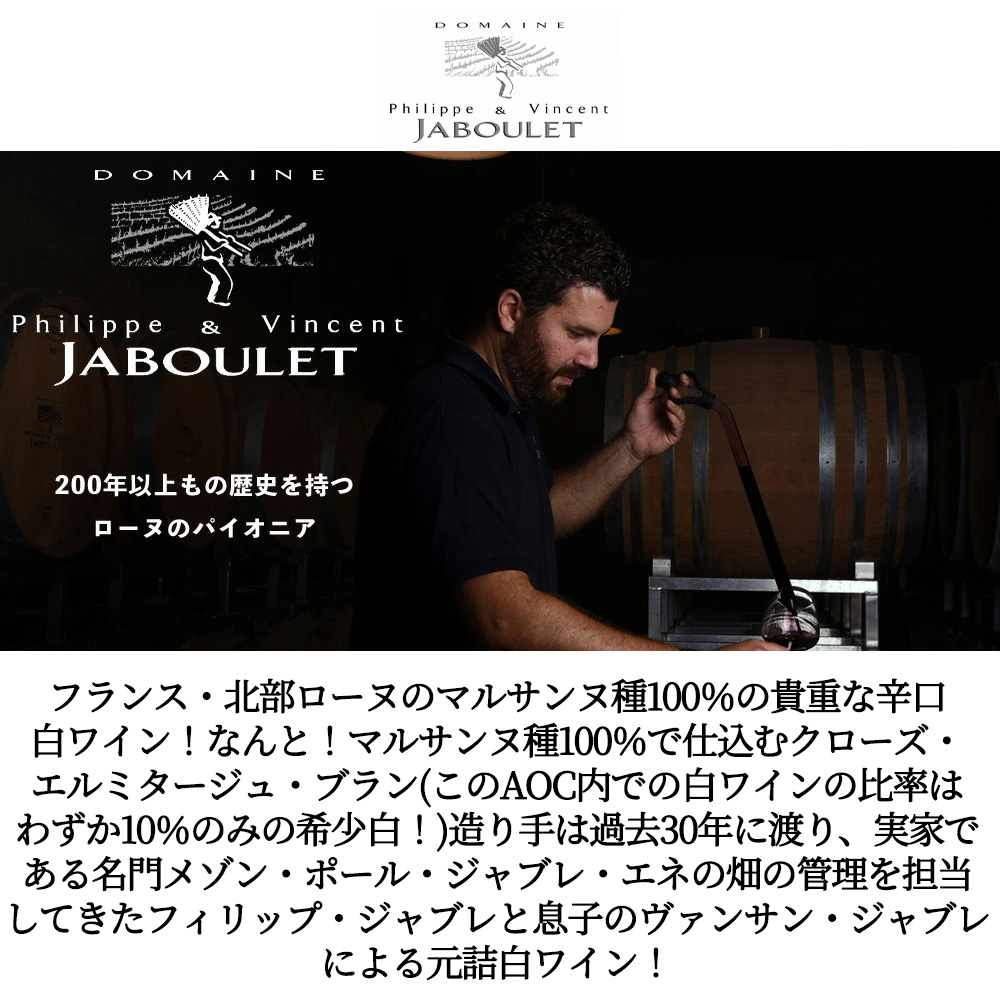 【商品名】クローズ・エルミタージュ・ブラン[2024]年・蔵出し作品・ドメーヌ・フィリップ・エ・ヴァンサン・ジャブレ元詰・AOCクローズ・エルミタージュ・ブラン・自然派・フランス農水省のHVE(環境価値重視)認証取得・マルサンヌ種100%・ステンレスタンクと樽で8-10ヶ月・(日本入荷わずか108本のみ)【英名】Crozes Hermitage Blanc 2024 Domaine Philippe & Vincent Jaboulet AOC Crozes Hermitage Blanc
