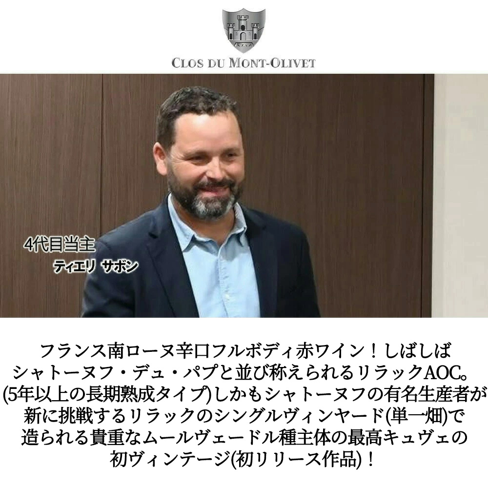【商品名】リラック・ルージュ・モンコー[2023]年・蔵出し限定作品・ドメーヌ・クロ・デュ・モン・オリヴェ(4代目当主・ティエリ・サボン家)元詰・AOCリラック・ルージュ・限定生産作品・2023VT初リリース作品のシングル ヴィンヤードのリラック!・デュミ・ミュイ樽(中樽=約600L樽)で18ケ月熟成・ベタンヌ+ドゥソーヴ2025版で満点5つ星&RVF誌2025版3つ星獲得・RVF誌2026年版驚異の92点獲得・日本入荷110本限り【英名】Lirac Rouge Mont-cau 2023 Domaine du Clos Mont Olivet (Joseph Sabon) AOC Lirac Rouge