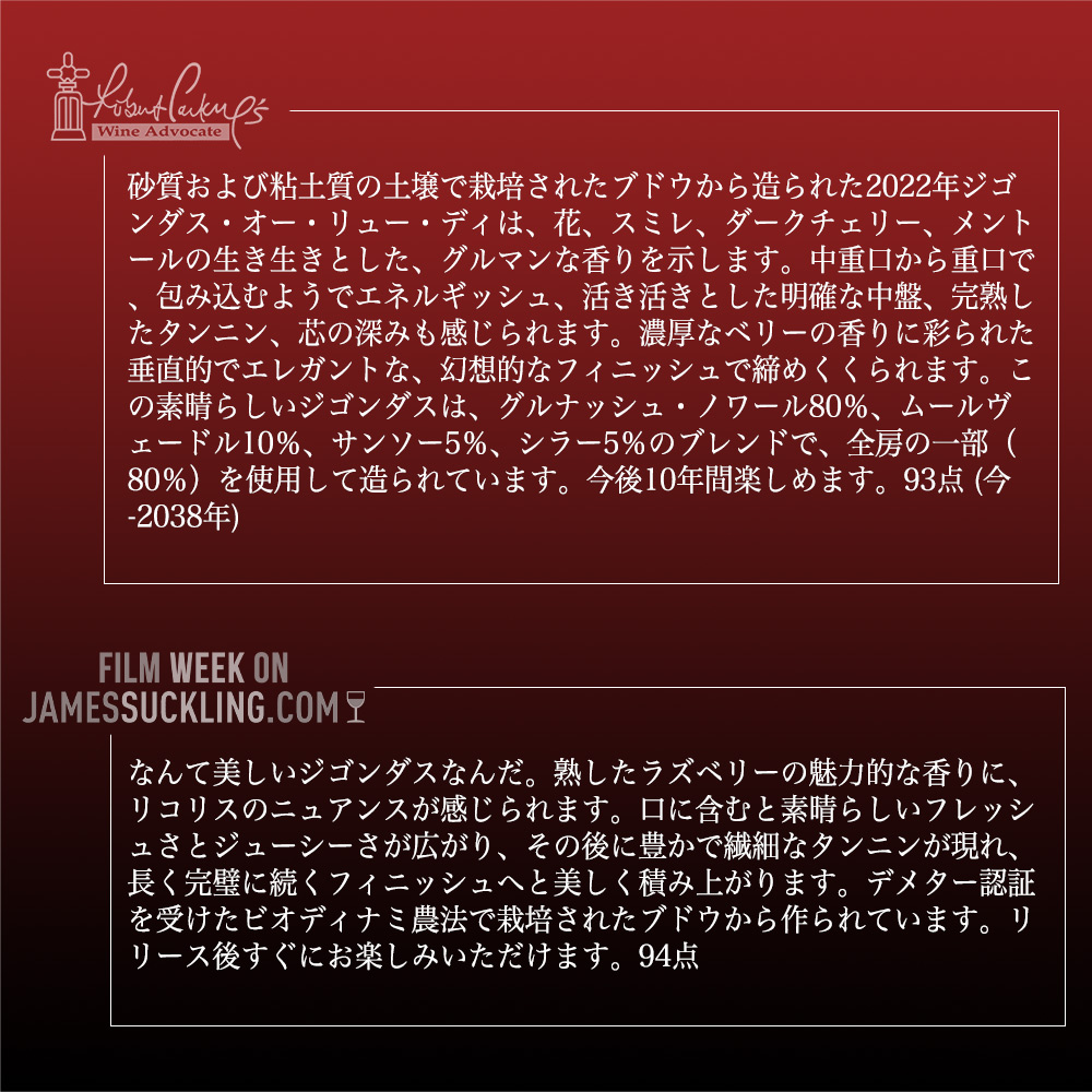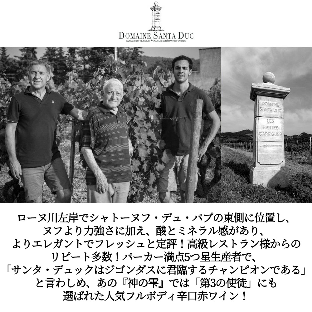 【商品説明】フランス南ローヌ究極フルボディ辛口赤ワイン愛好家大注目!あの味わい深い大人気赤ワインが待望の限定入荷! ローヌ川左岸で、シャトーヌフ・デュ・パプの東側に位置しヌフより力強さに加え、酸とミネラル感があり、よりエレガントでフレッシュと定評! 高級レストラン様からのリピート多数!優れたシャトーヌフ・デュ・パプに隣あうにふさわしい、アルコール分が強く、コクがあり、時には胡椒の香りのする南ローヌを代表する辛口赤ワイン!高級ジゴンダス! しかも8つの区画の葡萄を使用し、大樽とアンフォラで熟成させた、味わい深いジゴンダス大人気8つの区画の葡萄を使用し、大樽とアンフォラで熟成させた、味わい深いジゴンダス! ロバート・パーカー満点★★★★★5つ星生産者で、「私にいわせれば、サンタ・デュックはジゴンダスに君臨するチャンピオンである」と言わしめ、あの『神の雫』では「第3の使徒」に選ばれた人気フルボディ辛口赤ワイン! このスーパーグレイトヴィンテージの2022年でワインアドヴォケイト誌で驚異の93点 (今-2038年) の高評価獲得!絶賛コメントは『砂質および粘土質の土壌で栽培されたブドウから造られた2022年ジゴンダス・オー・リュー・ディは、花、スミレ、ダークチェリー、メントールの生き生きとした、グルマンな香りを示します。中重口から重口で、包み込むようでエネルギッシュ、活き活きとした明確な中盤、完熟したタンニン、芯の深みも感じられます。濃厚なベリーの香りに彩られた垂直的でエレガントな、幻想的なフィニッシュで締めくくられます。この素晴らしいジゴンダスは、グルナッシュ・ノワール80%、ムールヴェードル10%、サンソー5%、シラー5%のブレンドで、全房の一部(80%)を使用して造られています。今後10年間楽しめます。93点 (今-2038年) 』と大絶賛! ジェイムスサックリングでも驚異の94点獲得!絶賛コメントは『なんて美しいジゴンダスなんだ。熟したラズベリーの魅力的な香りに、リコリスのニュアンスが感じられます。口に含むと素晴らしいフレッシュさとジューシーさが広がり、その後に豊かで繊細なタンニンが現れ、長く完璧に続くフィニッシュへと美しく積み上がります。デメター認証を受けたビオディナミ農法で栽培されたブドウから作られています。リリース後すぐにお楽しみいただけます。94点』と大絶賛! ジャンシス・ロビンソン女史も高評価! 他のローヌより標高が高いジゴンダスは、ゆっくりと葡萄が完熟します!ジゴンダスの8ヵ所の異なる区画の葡萄から造られるワイン!全体の畑面積は7haで葡萄の平均樹齢は40年!収穫は畑で選別しながら手摘みで行います!さらに収穫後、選果テーブルで二度目の選別を行い、一部の葡萄は除梗します!その年の葡萄の状態、区画によって比率を変えています! 発酵は温度管理したステンレスタンクで20-30日間、その間、ルモンタージュを1日2回行います!発酵後、空気圧プレスで圧搾し、タンクでマロラクティック発酵!冬の間はタンク寝かせ、春になったら熟成容器に移します!熟成は36hLの円錐型のフードル(ストッキンガー製)と8hLのアンフォラで18ヶ月! (このジゴンダスの8つの異なった土壌の葡萄を使用。1つめは、第四期の赤粘土と砂利質の6区画、2つめは青粘土質、3つ目は白亜紀のマールと石灰岩土壌からのグルナッシュ75%、シラー10%、ムール・ヴェードル10%にサンソー5%!収穫は100%手摘み!熟成はフードルで18ヶ月! (新樽25%、大樽30%、1-4年バリック) で18ヶ月熟成!) フードルは丸みやバランスをもたらし、アンフォラからはピュアな酸や緊張感のあるテイストが現れます!清澄なし、フィルターをかけずにボトリング! 支配的な赤や黒の果実のアロマ、若いうちは洗練されたハーブの要素が感じられます!深く洗練された味わい!ゆっくりとした熟成が進むにつれてスパイスのニュアンスが出るようになります!ワインアドヴォケイト誌に「官能的なスタイルの素晴らしいワイン」と言わしめた究極フルボディ辛口赤ワインが、ワインアドヴォケイト誌が南ローヌに驚異の96点を出したスーパーグレイトヴィンテージの[2022]年で蔵出し限定作品の正規品で極少量入荷!