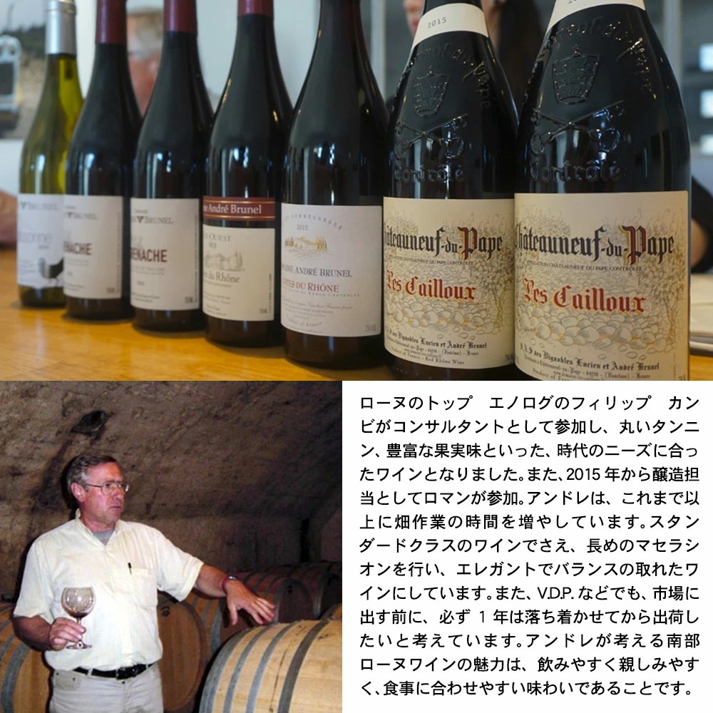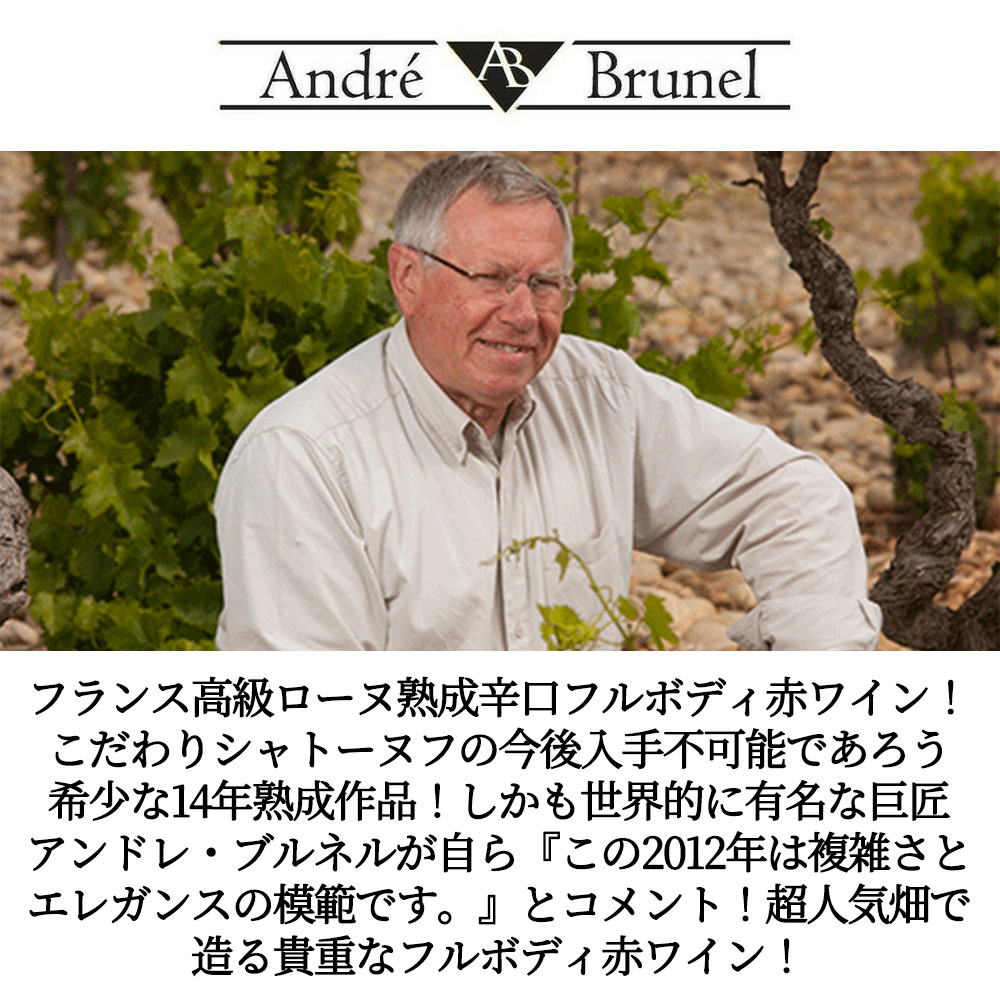 【商品説明】入手困難!フランス高級ローヌ熟成辛口フルボディ赤ワイン愛好家大注目!こだわりシャトーヌフ・デュ・パプ・ルージュの今後入手不可能であろう希少な14年熟成作品!しかも世界的に有名な巨匠アンドレ・ブルネル氏が醸造していた頃のバックヴィンテージで超人気畑で造る貴重なフルボディ人気辛口赤ワイン!しかもオーナー自ら『この2012年は複雑さとエレガンスの模範です。』とコメント!しかもワインアドヴォケイト誌でシャトーヌフに92点を付けるグレイトヴィンテージの[2012]年もの! しかもこのワインはインポーターさんのトップセールスが2026年4月にテイスティングし、あまりの素晴らしい熟成に感動して私どもに送られたワインです!しかもワイン評論家ロバート・パーカーが世界で159軒のみ選んだ世界の偉大なワイナリーのひとつに選出し、「彼の造る単なるコート・デュ・ローヌでさえ、並の生産者が造るシャトーヌフを上回る」と言われ、常に世界中からの引き合いが絶えない幻のワイン蔵!ブルネル家のトップ・キュヴェである、「シャトーヌフ・デュ・パプ・キュヴェ・サントネール」と同じポテンシャルになってくれることを期待して、植え替えを行った区画からの葡萄で造ります。土壌が理想的な状態になるまで10年も待ってから植え替えを行いました!「樹齢はまだ若く、現在はキュヴェ・レセルヴとしてリリース(当時)しているが、テロワールのポテンシャルを感じる。次世代のキュヴェ サントネールになるだろう。」とブルネル親子は語り、この区画に大きな期待をよせています!将来トップ・キュヴェに使わるかもしれないポテシャルを秘めた区画の葡萄から造られるワイン!凝縮した果実ときめ細かいタンニンの、ブルネルを代表するキュヴェである「レ・カイユ(小石)」は、葡萄畑に無数にある丸い石から、1954年に祖父が名付けました!ブルネルを代表するキュヴェ! このワインでワインアドヴォケイト誌で驚異の91点獲得!絶賛コメントは『より軽やかで、エレガントかつシームレスなこのキュヴェの例である2012年のシャトーヌフ・デュ・パプは、美しい甘いチェリー、ラズベリー、砕いた花、そしてガリッグのほのかなニュアンスを示しています。70%グルナッシュ、17%ムールヴェードル、10%シラー、3%サンソーのブレンドで、80%デステム(茎を取り除く)され、コンクリートタンクと1-2年使用の樽(シラーのみ)で熟成されました。この美しさは既に楽しめますが、今後10~12年で優雅に進化していくでしょう。91点』と絶賛コメント! ワインスペクテーター誌でも驚異の91点獲得!ワインエンスージアスト誌でも驚異の92点の高評価を獲得! 樹齢驚異の45年の70%グルナッシュ、20%ムールヴェードル、10%シラー(ドメーヌからの情報)で造られます。グルナッシュ・ノワールからは柔らかさ、ムールヴェードルからはストラクチャーを、シラーからは鮮やかな色とタンニンを与えます!また、土壌によって味わいが異なり、石の多い土壌は力強さ、集約があるワインを生み、砂質の土壌は柔らかく、フィネスのあるワインを生みます!収穫量は30hL/haです!シラーは早熟の為、別で醸し、その他の品種は、12区画から得られる葡萄を、土壌タイプ別に五つのエリアに分けて醸します!グルナッシュ・ノワールは70%、他は全て除梗し、25度にてコンクリートタンクで発酵させます!5週間、スティラージュとデレスタージュします!シラーは樽(1~2年)、他はコンクリートタンクで18ヶ月熟成させます!シラーの樽は、ブルゴーニュの生産者が使ったものを購入していて、タンニンを和らげる効果があります!瓶詰めの6ヶ月前にブレンドします!清澄せず、軽くろ過します!温暖化の影響で力強いワインになりがちで、特に石の多い畑は太陽熱を蓄積します!また、樹齢の高い葡萄が多いため、さらに集約が強くなります!そのような条件の中で、エレガントでフレッシュなワインを造るのは簡単ではありません!紫紅色、タンニンが強くて酸もあり、フルボディで、凝縮し傑出した味わいを持っています! 以下蔵元からのコメントは『このキュヴェは、ぶどう畑に無数に存在する丸い小石にちなんで名付けられ、同時にドメーヌの名前の由来にもなっています。ぶどう畑は複数の区画で構成されており、それぞれが独自の特性を持ち、このワインに驚くべき複雑さを与えています:ボワ・ド・ラ・ヴィルとレ・セールは水はけを完璧にする砂利層が欠乏しており、非常に濃縮された果汁を得るのに適しています。ファルゲロルとカンソーは赤色と青色の粘土を持ち、非常に豊かな香りの特性を誇ります。最後にカブリエールとレヴェスの区画では、チョークのような石灰岩が全体の構造と長い余韻をワインに与えています。』 またワインへのテイスティングコメントは『完璧に熟したブドウと濃縮感とフレッシュさの独特のバランスを持つ美しい収穫。2019年は、卓越したヴィンテージである2010年や2016年と合わせることができます。その複雑さと
