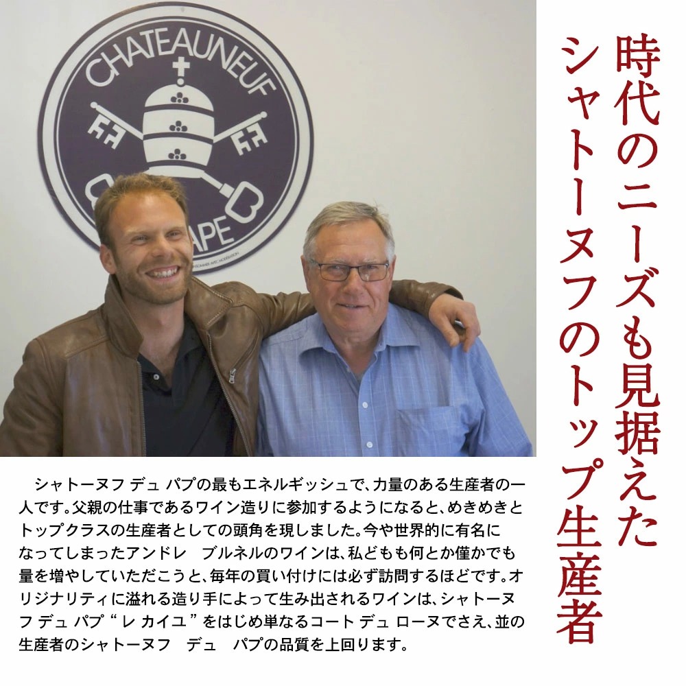 【商品名】シャトーヌフ・デュ・パプ・ルージュ・レ・カイユ[2012]年・蔵出し限定作品・ドメーヌ・アンドレ・ブルネル元詰・AOCシャトーヌフ・デュ・パプ・ルージュ・(ロバート・パーカーが世界で159軒のみ選んだ世界の偉大なワイナリーのひとつ)・赤・フルボディ(重口)・14%・WA誌91点&WS誌91点&WE誌92点獲得・希少な14年熟成作品・14%・今は亡き偉大な父アンドレが醸した貴重なバックヴィンテージ