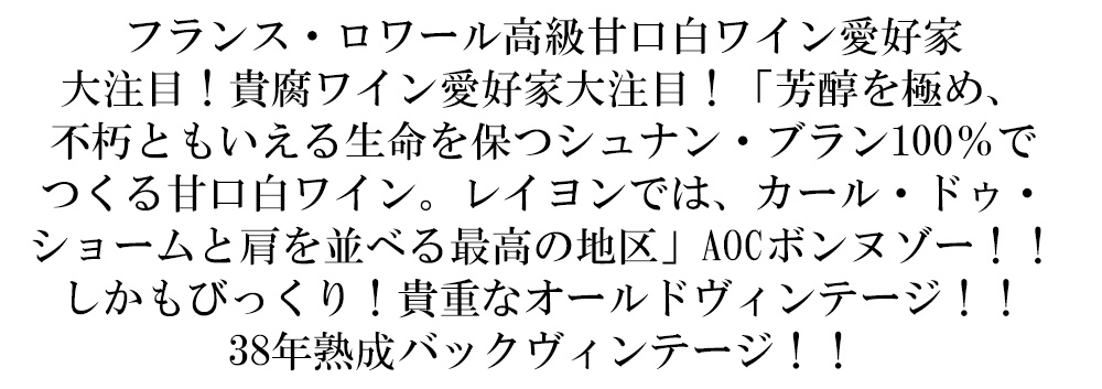 ![]() ボンヌゾー レ ペリエール 1987 ボナン家元詰 ドメーヌ ラ クロワ デ ロージュ AOCボンヌゾー ■平均樹齢:45年 ■残糖:70g ■土壌:シスト土壌 ワイン評論家のヒュー・ジョンソン氏に「芳醇を極め、不朽ともいえる生命を保つシュナン・ブランでつくる甘口白ワイン。コトー・デュ・レイヨンでは、カール・ドゥ・ショームと肩を並べる最高の地区」と★★★―★★★★4つ星獲得!と絶賛させたAOCボンヌゾー!! ビロードのようななめらかな甘口白ワインで、35年の歳月を経てなお湧き上がる洋ナシや蜂蜜やスモモの風味に、しっかりした酸!味わい深さと豊かなコクのとても上品な口当たり! 長い熟成によってもたらされた蜜のような甘味が最高の飲み頃人気甘口白ワインが蔵出しで限定少量入荷! これから38年を迎える方、1987年生まれ(昭和62年生まれ)の方へのバースデープレゼントに最適です! |