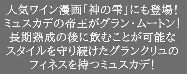 ![]() ミュスカデ グラン・ムートン 2019年 ドメーヌ・グラン・ムートン平均樹齢75年の古木に由来。数あるロワールの白ワインの中で「ミネラル香が特徴で最も新鮮」、「味・香り共に抜群」と高い評価を受けている白ワインです。『神の雫』14巻第132話に登場。 |