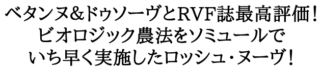 ドメーヌ デ ロッシュ ヌーヴでは、2000年から有機栽培を行い、2003年には、所有畑28ha全てで、ビオロジック農法を実施しました。さらに馬2頭による耕作を行ったり、偉大なテロワールの区画では、ドメーヌ ルロワやビゾのように、枝の先端は切らずに曲げることで、自然本来の木のエネルギーや流れを奪わないようにするなど、健全なブドウ栽培を行い、美しいバランスのワインを造っています。