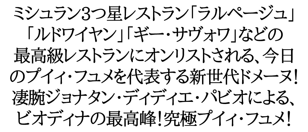 プイィ・フュメ・ウーリトミー[2018]年 ぶどう品種:ソーヴィニヨン・ブラン100% このプイィ・フュメ・ウーリトミーは、 プイィ・シュル・ロワール村にあるわずか 1haのビオディナミの区画「レ・マルヌ」 (ロワール川に迫る急斜面上の畑で、 泥灰土石灰質(キンメリッジアン)土壌)からの 平均樹齢45年のソーヴィニヨン・ブラン100%を コンクリートタンクで発酵後、228リットルの樽で 12ヶ月間熟成で造られる樽熟の究極プイィ・フュメ! 作品名の「Eurythmie」は「 (しばしば芸術における)均整」の意味で、 「バランス」こそがワインにおける最重要概念で あることを表現したもの! ずばりジョナタン・ディディエ・パビオが誇る 最高級辛口白ワイン!
