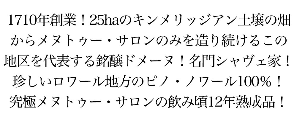 ![]() メヌトゥー・サロン・ルージュ[2010]年 ■葡萄品種:ピノ・ノワール100% サンセールの南西に位置する珍しく、そして人気のAOCメヌトゥー・サロン!ワインエンスージアスト誌他各ワイン誌大絶賛の人気ドメーヌ! しかも珍しいロワール地方のピノ・ノワール100%! 2005年からは中央ロワールで初めて自然派「ラグリキュルチュール・レゾネ」と「カリテール」をダブル獲得するなどその高度な品質管理は周りの生産者のお手本となり、又ボリューム感のある彼らのワインは各種ワインコンクールや多数のワインメディアで紹介され、しかもその半分以上が国内外のレストランに直行! 「熟成によって複雑味を増した、メヌトゥー・サロンの真の味わいを知っていただきたい」という彼らのポリシーのもとリリース! ![]() |