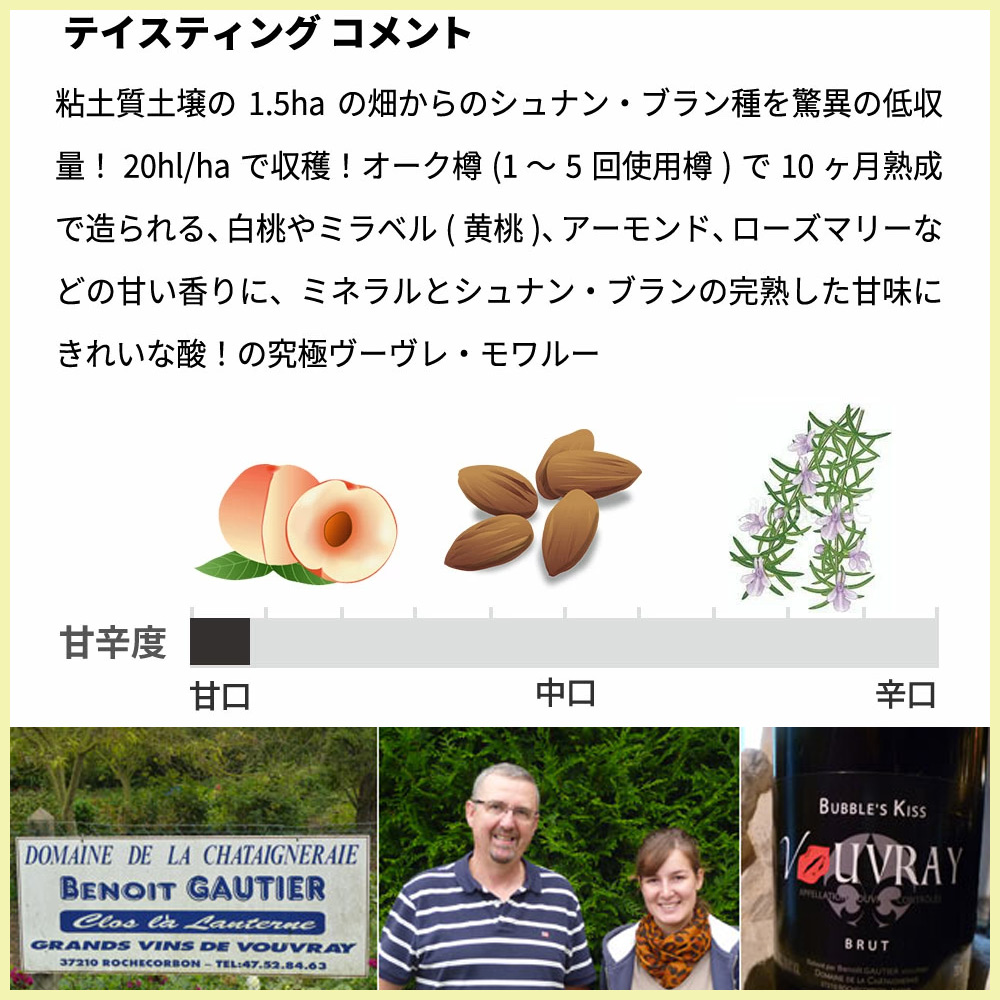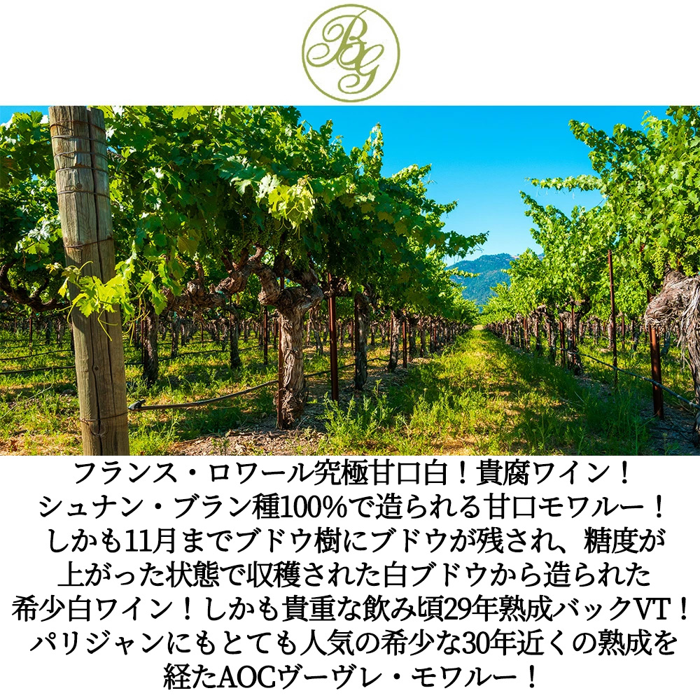 【商品説明】入手困難!ロワール究極甘口白ワイン愛好家大注目!デザートワイン愛好家、貴腐ワイン愛好家も大注目!シュナン・ブラン種100%で造られるモワルー!しかも11月までブドウ樹にブドウが残され、糖度が上がった状態で収穫されたブドウから造られた希少ワイン!しかも貴重な飲み頃29年熟成バックヴィンテージ! ロワールのワインは“パリジャンのワイン”と呼ばれます!しかもトゥールの東にある重要で大人気の白ワイン生産地AOCヴーヴレ! 造り手は、ワインスペクテーター誌大注目!ワインアドヴォケイト誌大注目!ラ・レヴュ・デュ・ヴァン・ド・フランス誌も大注目!のロワール地方はトゥール市近郊のロシュ・コルボン村に17世紀から続く歴史ある造り手で、1981年に7代目の現当主ブノワ・ゴティエ氏が継承!多様なテロワールで構成される「ヴーヴレAOC」のシュナン・ブラン種に誇りを持っており、「シレックス土壌のものはフュメ香」「石灰質土壌のものはミネラル感」「粘土質土壌のものはたっぷりとした果実味」というふうに土壌・テロワールの特徴をそのままワインに表現することを心がける! このヴーヴレ・モワルー“キュヴェ・クロ・ラ・ランテルヌ”モワルー (樽熟) [1996]年は粘土質土壌の1.5haの畑からのシュナン・ブラン種を驚異の低収量!20hl/haで収穫!オーク樽 (1-5回使用樽) で10ヶ月熟成で造られる、白桃やミラベル (黄桃) 、アーモンド、ローズマリーなどの甘い香りに、ミネラルとシュナン・ブランの完熟した甘味にきれいな酸!の究極ヴーヴレ・モワルーAOCの30年近くの熟成を経た29年熟成作品が限定で、しかも現地のセラー数ヶ月前の蔵出し作品で限定少量入荷!