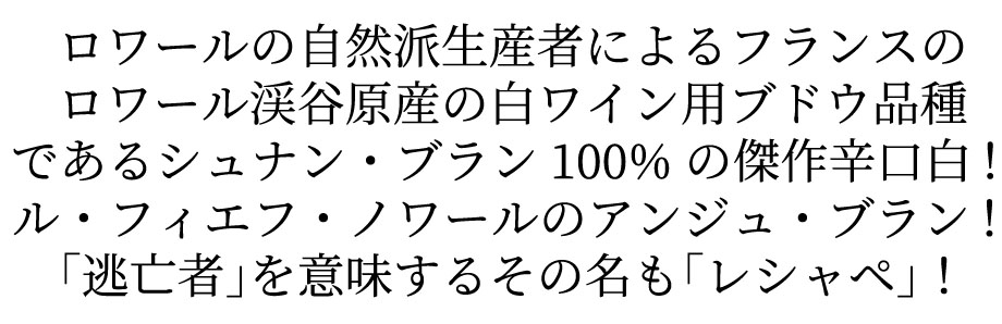 レシャペ 2022 蔵出し品 ドメーヌ ル フィエフ ノワール元詰 シュナン ブラン種100% 自然派 ビオ ヴァン ナチュール AOCアンジュ ■ぶどう品種:シュナン100% ■発酵・熟成:ステンレスタンクで発酵後、6ヶ月間熟成 ■樹齢:約25年 ■土壌:砂質、粘土砂礫質、シスト土壌 ■収量:40hl/ha ■ 葡萄園面積:8ha 造り手のドメーヌ・ル・フィエフ・ノワールは「Guide Hachette」、「La Revue du Vin de France」、「Le Figaro」、「Le Point」等も大注目! 「前オーナーの意志を引き継ぐ形で2015年に「ECOCERT」の認証を取得する一方、(ビオロジック栽培で認められている)銅の使用を停止し、独自に調合したハーブの煮汁を畑に撒くなど、ビオディナミの手法を導入しました。近年中に正式にビオディナミに移行する予定です」 「立ち止まって、時間をかけて、自分自身と対話したくなる。そんなワインを造りたいと思っています。その対話は、飲み手と私たち造り手の対話でもあります。一杯のワインが生み出す世界の中で、飲み手と造り手が時空を超えて対話することができる。私たちが醸造家になって本当によかったと思う最大の理由です」