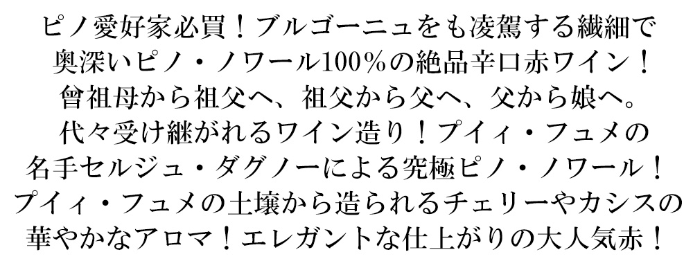 ![]() セルジュ ダグノー コート ド ラ シャリテ PN レ モンテ ド サン レイ 2018 セルジュ ダグノー エ フィーユ元詰 自然派ヴァンナチュール ■ぶどう品種:ピノ・ノワール種100% ■発酵・熟成:10~15日間発酵/フレンチオークのバリック(5~10%新樽)で10~12ヶ月熟成 ■土壌:粘土とチョークに鉄分の混ざる土壌 ■収穫:手摘み ブルゴーニュを凌駕する繊細で奥深いピノ・ノワール種100%辛口赤ワインファン大注目!ピノらしいエレガントな仕上がりの大人気辛口赤ワイン! ロバート・パーカー氏「最良の生産者評価」5つ星生産者で1830年からの歴史を持つ人気生産者!(現在はヴァレリー・ダグノー(セルジュの娘)が当主)で3つ星レストランのロブション、ロランジェ等でもオンリスト! フランスワイン権威評価誌アシェット・ガイド誌でも大注目! 曾祖母から祖父へ、祖父から父へ、父から娘へ。代々受け継がれるワイン造り!プイィ・フュメのセルジュ・ダグノーによる、まさに究極ピノ・ノワール100%辛口赤ワイン!! |