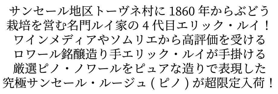 サンセール ルージュ 赤 2019 エリック ルイ家 自然派 リュット レゾネ (実質ビオロジー) AOCサンセール ルージュ ミディアムボディ ■ぶどう品種:ピノ・ノワール種100% ■土壌:粘土石灰質土壌 究極造り手からのピュアな造りで表現した人気サンセールの赤! サン・テグジュペリの“星の王子さま”の中の「本当に大切なものは目に見えない。」というキツネの有名なセリフに「栽培家、醸造家としての知識や先入観にとらわれることなく、素直な心で“感じるもの”を大切にするようになりました。」と彼自身が素直に述べるように、このエリック・ルイ・サンセールAOCの赤は、実質ビオロジックの極めて厳格なリュット・レゾネ栽培を実践する契約栽培農家からぶどうで購入! ぶどう本来の果実味と土壌由来のミネラル感が一体化した人気辛口赤ワイン! ラベルの絵もサン・テグジュペリ自身が描いた“星の王子さま”の挿絵からエスプリを得て、ラベルデザインの変更を行いました!