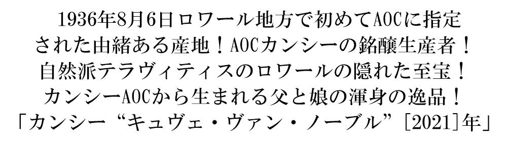 ![]() カンシー“キュヴェ・ヴァン・ノーブル”[2021]年・現地蔵出し品・ドメーヌ・タタン元詰・(ジャン・タタン&マルシア・ウィルク・タタン家)・(ソーヴィニヨン・ブラン100%)・AOCカンシー・自然派テッラ・ヴィティス ■ぶどう品種:ソーヴィニヨン・ブラン種100% ■発酵・熟成:温度管理したステンレスタンクで発酵 フランス・ロワール地方辛口白ワイン愛好家大注目! ドメーヌでの垂直試飲では10年間の熟成でも十分に楽しめることが証明されています! ワインは透明感のあるアロマ、白い花や洋梨、白桃、青リンゴ、ハーブ、レモンなどのシトラス系果実、パプリカなどが感じられます! ミネラル感があり、ほろ苦さと爽やかさの中にある適度な塩分はカキなどのシーフードと相性バツグンです! |