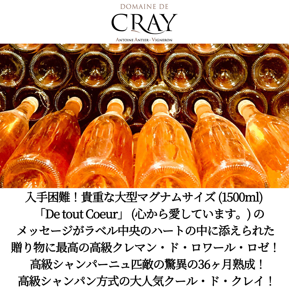 【商品名】【大型】クレマン・ド・ロワール・ブリュット・ロゼ・“クール・ド・クレイ”(愛のメッセージ)手摘み100%・シャンパン方式(瓶内2次発酵)(メソッド・トラディショナル)・蔵出し作品・自然派リュット・レゾネ(樹齢驚異の約50年のVV)・ドメーヌ・ド・クレイ元詰(アントワンヌ・アンティエ家)・AOCクレマン・ド・ロワール・ロゼ(ハートラベル)・大型マグナムサイズ・1500ml・1.5L【英名】Cremant de Loire Brut Rose Coeur de Cray Message d'Amour Methode Traditionnelle NV Antoine Antier AOC Cremant de Loire Brut Rose