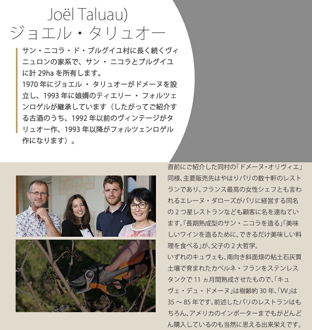 サン・ニコラ・ド・ブルグイユ村に長く続くヴィニュロンの家系で、サン・ニコラとブルグイユに計29haを所有します。1970年にジョエル・タリュオーがドメーヌを設立し、1993年に娘婿のティエリー・フォルツェンロゲルが継承しています(したがってご紹介する古酒のうち、1992年以前のヴィンテージがタリュオー作、1993年以降がフォルツェンロゲル作になります)。