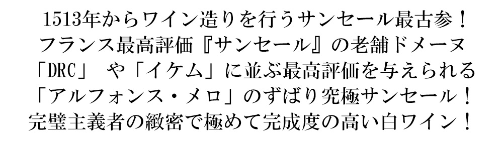アルフォンス・メロの評価は高く、ベタンヌ&デゥソーヴやルヴュー・デュ・ヴァン・ド・フランスでの高評価以上に世界各国の有名レストランのワインメニューに掲載されるサンセールとして知られています。 また、2017年度の「メイユール・ヴァン・ド・フランス」では3ツ星に昇格するなど、更なる飛躍を遂げています