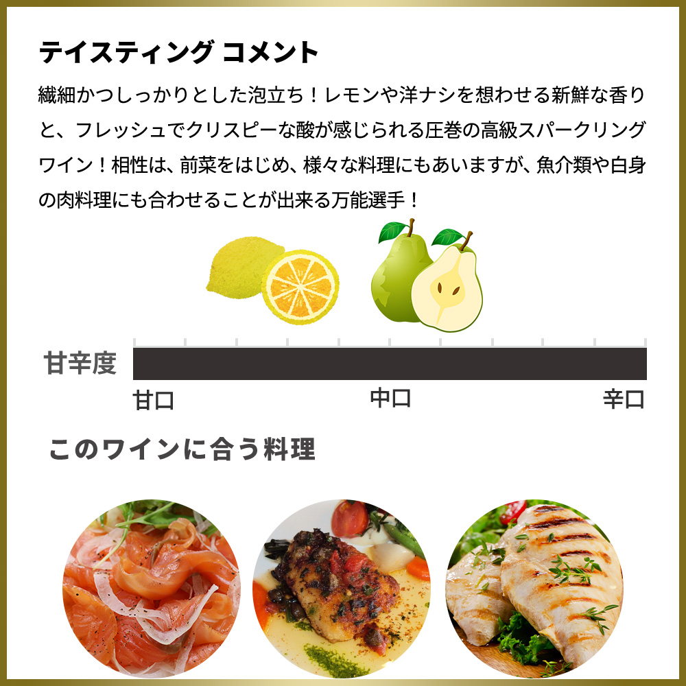【商品説明】シャンパーニュ辛口愛好家大注目!高級クレマン・シャンパン方式愛好家大注目!スパークリング愛好家必買!超人気シャンパン方式(瓶内二次発酵)本格派辛口スパークリングワイン!ロワール「泡のスペシャリスト」による熟成を大切にしたソミュールの自然派スパークリングワイン!造り手はロワールを代表するスパークリングワインのスペシャリスト!“ルイ・ド・グルネル”!輸入元様の説明は『設立は1859年に遡る、ソミュール地方で今もなお続く数少ない家族経営のエステイトです。当時造られたトゥファ(石灰華)層を削り出したセラーではスパークリングワイン造りにのみ特化し、繊細で複雑、洗練されたスパークリングワイン造りが続けられています。カーヴは地下12メートルの深さにあるもともとは15世紀に掘られた採石場跡を利用したもので、醸造や熟成もここで行われます。4百万本のストックを保管する比較的大きなカーヴですが、グルネルでは伝統を大切にしワインは長期の熟成を経てから出荷しています(法定熟成期間がクレマンの場合12ヶ月のところを24ヶ月、ソミュール・ブリュットの場合9ヶ月のところを36ヶ月)。また栽培ではリュット・レゾネを実践しています。Les Intemporelles(時代を超えた~)シリーズはメゾンのエッセンスを集めたコレクション。このシリーズはブレンドの技による芸術品であり、偉大な精製技術によって洗練され、気品、熟成感、そして生き生きとした果実味を持ち合わせています。このスタイルはカーヴの当主によって磨き継承されたもので、真に調和のとれたスタイルをめざし丁寧に造られ、ブレンドされたものなのです。』この「クレマン・ド・ロワール・ブリュット」は、テュフォーと呼ばれる石灰質土壌からのリュット・レゾネの樹齢20年以上のシュナン・ブラン70%、シャルドネ20%、カベルネ・フラン10%!瓶内二次醗酵!瓶内熟成24ヶ月でリリースされる、ドサージュ7.5g/Lの究極辛口クレマン・ド・ロワール!繊細かつしっかりとした泡立ち!レモンや洋ナシを想わせる新鮮な香りと、フレッシュでクリスピーな酸が感じられる圧巻の高級スパークリングワイン!相性は、前菜をはじめ、様々な料理にもあいますが、魚介類や白身の肉料理にも合わせることが出来る万能選手!高級シャンパーニュ製法の高品質クレマン・ド・ロワールが正規代理店輸入品で限定で少量入荷!