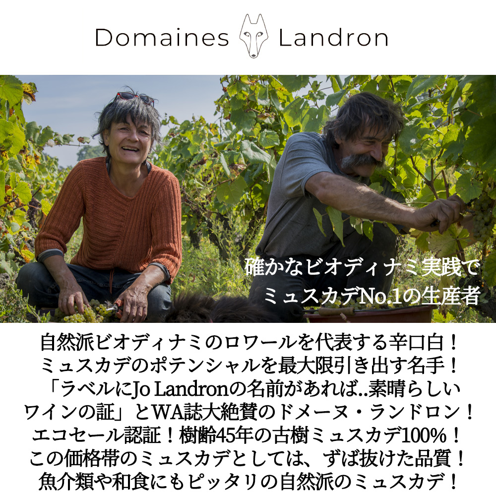 【商品説明】フランス辛口白ワイン愛好家大注目!ロワール辛口白ワイン愛好家大注目!自然派ビオディナミファン大注目!ロワール地方のキレあり辛口白ワインの代名詞!ロワールのワインは“パリジャン”のワインと呼ばれます!華麗な古城が点在する風光明媚なロワール川の流域にあるナント市から、フレッシュ&クリスピーな爽やかさが特徴のフランスを代表するすっきり辛口白ワイン! しかもワインアドヴォケイト誌で「ラベルにJo Landronの名前があれば..素晴らしいワインの証」と大絶賛! ミュスカデのポテンシャルを最大限引き出すトップクラスの名手! ドメーヌ・ランドロンについてインポーターさんは「ピエール・ランドロン氏により1945年に設立された家族経営のドメーヌで、現在は息子のジョゼフ・ランドロン氏がワイン造りをしています。ナント地方の南にあるミュスカデ地区でもトップクラスのブドウ畑を所有し、26へクタールの畑の95%でこの地方唯一の品種、ムロン・ド・ブルゴーニュを栽培しています。ドメーヌが誇る複雑で個性的なテロワールは、ランドロン家がこだわるシュール・リー法によって、その個性が存分に発揮されたそれぞれのワインとなります。「ミュスカデはワインが造り出される土壌のありのままの姿であるべきだ」という哲学同様、品質に対する姿勢と結びついています。」 このミュスカデ・セーヴル・エ・メーヌ シュール・リー ラ・ルヴトゥリ[2023]年は、「爽やかなミュスカデにとどまらない。フレッシュさを持ちながらも熟度と深みのある味わい。一味違うミュスカデの表現。」! 粘土質、砂礫土壌からの樹齢45年以上のヴィエイユ・ヴィーニュ (古樹) の自然派のミュスカデ100% (自然派ビオディナミ・Ecocert (エコセール) 認証) をステンレスタンク醗酵!コンクリートタンク熟成14ヶ月 (シュール・リー) !緑がかった黄色!程良く熟した柑橘系の香りと爽やかな風味を持ち、まろやかな口当たりとさわやかな余韻が感じられます!この価格帯のミュスカデとしては、ずば抜けた品質を持っています!伝統的なフルートボトルに詰められています!クリーミーで滑らかなテクスチャーが続くため、食事と合わせて楽しむのに非常に適しています!魚介類や和食にもピッタリの自然派オーガニックワイン!こだわりのランク上のミュスカデが限定入荷!