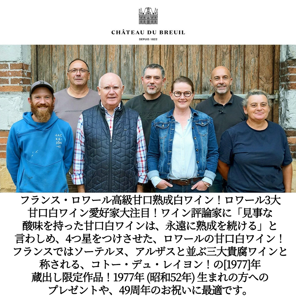 【商品説明】入手困難!フランス・ロワール高級甘口白ワイン愛好家大注目!ロワール3大甘口白ワイン愛好家大注目!貴腐ワイン愛好家も大注目!極甘口白ワイン愛好家垂涎!非常に希少なヴィンテージ!しかもワイン評論家のヒュー・ジョンソン氏に、「見事な酸味を持った甘口白ワインは、永遠に熟成を続ける」と言わしめ、4つ星をつけさせた、ロワールの甘口白ワイン!フランスではソーテルヌ、アルザスと並ぶ三大貴腐ワインと称される、コトー・デュ・レイヨン!の[1977]年もの!ベタンヌ&ドゥソーヴ大注目!飲み頃!49年熟成バックヴィンテージ!しかも非常に希少でワイン市場でも少ない[1977]年もの! 造り手は、ボーリュー・シュル・レイヨン村にて1822年より続くシャトーで、この地を代表するシャトーのひとつで、ベタンヌ&ドゥソーヴ誌でもレイヨンの6人のひとりとして掲載!ほぼ毎年のように登場する不動のプレステージであり続けています。現在は、レイヨン、サヴニエール、アンジューに計30haの畑を所有!!このオールドヴィンテージは、前オーナーのマルク・モルガが造り、貯蔵していた超希少ストックです。 ボーリュー・シュル・レイヨン村のシスト土壌の自社畑からのVV (ヴィエイユヴィーニュ) のシュナン・ブラン種100%を収量25-30hlの低収量。長期熟成を目指すためステンレスタンクで醸造&7ヶ月熟成!残糖は50-60g/L!しかも49年と言う長期の眠りを経て (カーヴで大切に熟成!) ようやく蔵出しで目を覚ました貴重な蔵出し秘蔵古酒!しかも素晴しいものだけをリリース!というこだわりのレイヨンの希少!ヴィンテージ!!甘口白ワインファン!貴腐ワインファン垂涎!しかも現地のセラー数ヶ月前の蔵出し作品で限定少量入荷!1977年 (昭和52年) 生まれの方へのプレゼントや、49周年のお祝いに最適です。