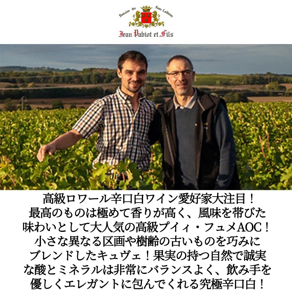 【商品説明】フランス・ロワール地方大人気辛口白ワイン愛好家大注目!大人気ソーヴィニヨン・ブラン種100%辛口白ワインファン大注目!最高のものは極めて香りが高く、風味を帯びた味わい!として大人気のプイィ・フュメAOC!ロバート・パーカー氏のバイヤーズ・ガイドでも最良生産者の一人として紹介!アシェット・ガイド誌でもWスター (2つ星) で大注目!ジルベール・ガイヤール2012年版-2015年版連続掲載! 造り手は19世紀末からプイイ・シュール・ロワールで初代オーナー、ルイ・パビオから数世代に渡り歴史ある小規模生産者で、家族経営のドメーヌ・ジャン・パビオ家!小規模ながら恵まれたテロワールの畑を所有していることで有名なドメーヌですが、生産量が少ないため、そのほとんどがフランス国内のレストランや愛好家に直行!もちろん日本ではあまり目にすることがなかった造り手です! Silex (火打ち石) 含有の石灰質土壌と粘土石灰質の畑からのソーヴィニヨン・ブラン種100%を天然酵母で発酵!数ヶ月間シュール・リーで熟成されリリースされるドメーヌ・デ・ファン・カイヨが所有する、小さな異なる区画や樹齢の古いものを巧みにブレンドしたキュヴェ! 華やかな緑のハイライトを帯びた鮮やかな淡いゴールデン・イエロー!パプリカ、土、ハーブ、メロン、マンゴー、白桃、アプリコット、パイナップル、ブラッドオレンジ、マルメロ、パッションフルーツ等がよく熟し複雑に絡む香り!豊かな果実味によるリッチな口当たりとフレッシュ感が調和!果実の持つ自然で誠実な酸とミネラルは非常にバランスよく、飲み手を優しくエレガントに包んでくれる究極辛口白ワインが限定で、しかも蔵出しの正規品で極少量入荷!