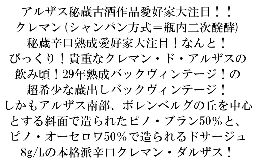 ![]() クレマン・ド・アルザス クロ・デ・パイアン ブリュット1996年 セッピ・ランドマン アルザス南部、ボレンベルグの丘を中心とする斜面で造られたピノ・ブラン50%と、ピノ・オーセロワ50%で造られるドサージュ8g/Lの本格派。 |