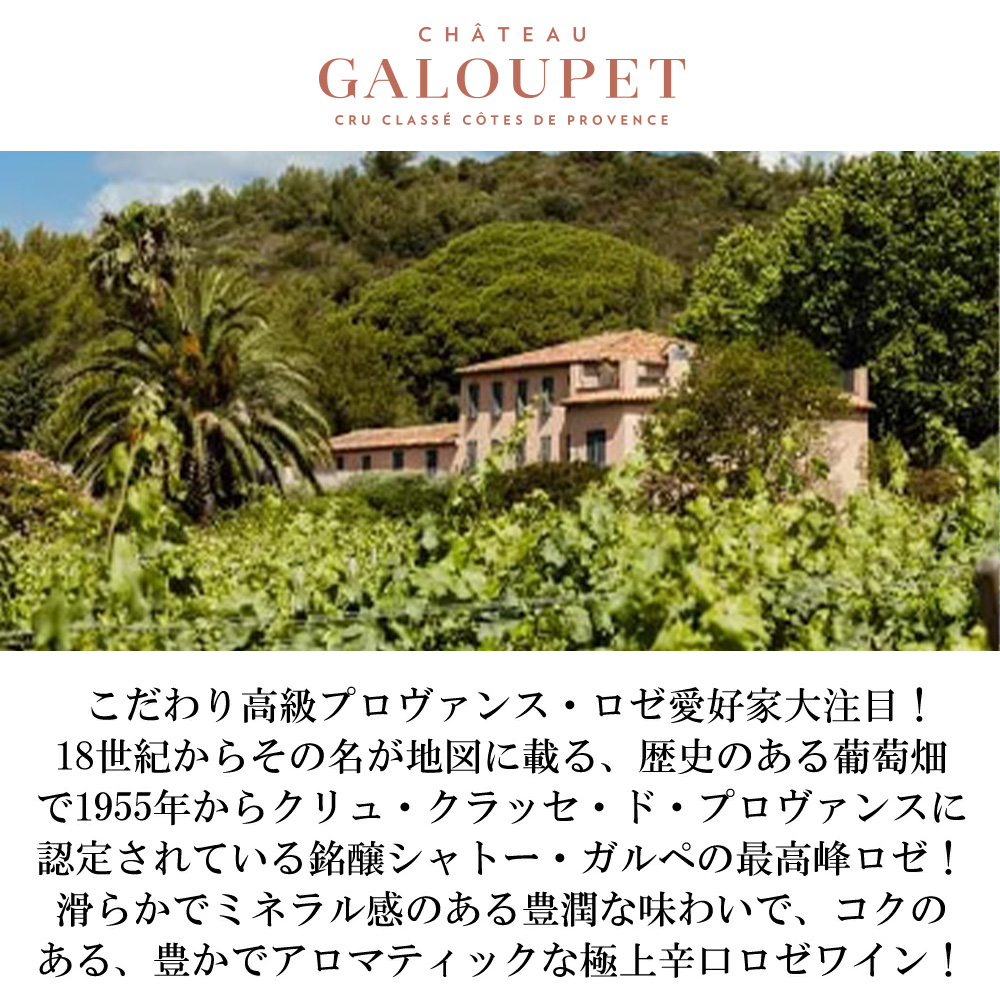 【商品名】シャトー・ガルペ・クリュ・クラッセ・ド・プロヴァンス・ロゼ[2023]年・AOCコート・ド・プロヴァンス・ロゼ・正規代理店輸入品・アルコール度数14%・ロゼ・辛口・ロウ封印キャップ【英名】Chateau GALOUPET Cru Classe de Provence 2023