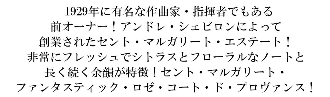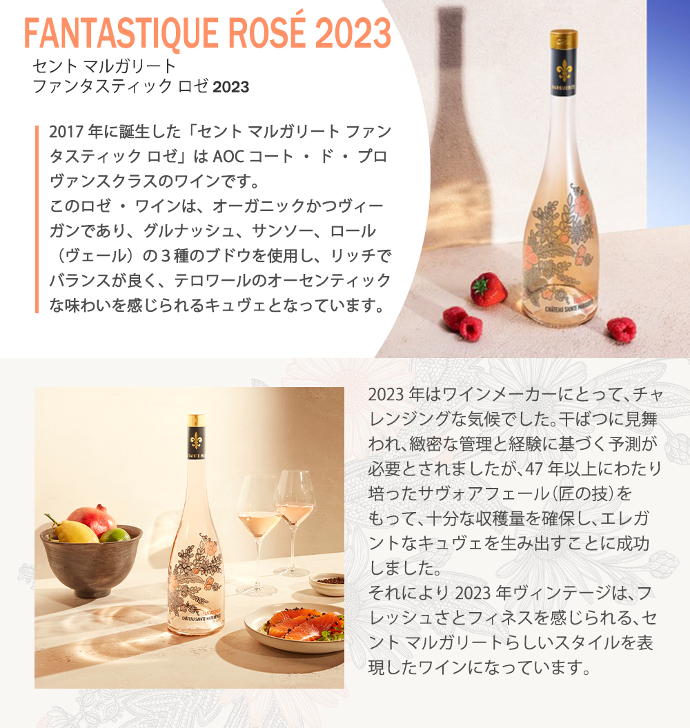 【商品名】 正規品 セント マルガリート ファンタスティック ロゼ コート ド プロヴァンス 750ml 13% ロゼワイン 辛口 【英名】CHATEAU SAINTE MARGUERITE FANTASTIQUE ROSE 750ml 13% 【商品説明】フランス高級ロゼワインの生産地で知られるコート・ド・プロヴァンスのテロワール、高品質、受け継がれる匠の技によって生み出されるこだわり辛口ロゼワイン!!1929年に有名な作曲家・指揮者でもある前オーナー!!アンドレ・シェビロンによって創業されたセント・マルガリート・エステート!!その名はルイ9世の妻で、強い女性として有名なプロヴァンス出身のマルガリート妃にちなんで名付けられました!!1977年にわずか3ヤードからスタートしましたが、現在では、約230ヤードへと大幅に拡大しました!!ラ・ロンドのぶどう畑は高く評価されていることからもわかるように、最高級のワインを造ることをモットーとし、ブドウ栽培、醸造学に情熱を注ぎました!!その後45年を過ぎた今もなお、そのビジョンは変わらず、2代目に受け継がれています!!ブドウ畑からはイル ドール諸島を見渡せます!!それは素晴らしいラ・ロンドの沿岸部のテロワールで、地中海とイル ドール諸島がすぐ近くにあるということは、温暖な冬、少ない雨量、長い日照時間というブドウ栽培に適した環境を生み出されています!!そんなセント・マルガリート・エステートより2017年に誕生したセント マルガリート ファンタスティック ロゼ!!入荷!!このロゼ・ワインは、オーガニックかつヴィーガンであり、グルナッシュ、サンソー、ロール(ヴェール)の3種のブドウを使用し、リッチでバランスが良く、テロワールのオーセンティックな味わいを感じられるキュヴェとなっています!!輝くハイライトが入った、パールがかったピンクカラー!!アロマは白い桃や梨、ライチのトロピカルな香りとパッションフルーツ、グレープフルーツのニュアンス!!味わいは非常にフレッシュでシトラスとフローラルなノートと長く続く余韻が特徴!! 【タイプ】辛口・ロゼワイン 【生産年】2023 【生産者】ファイヤール家 【生産地】フランス/プロヴァンス 【品種/セパージュ アッサンブラージュ】グルナッシュ、サンソー、ロール(ヴェール) 【内容量】750ml 【JANコード】0107004000392