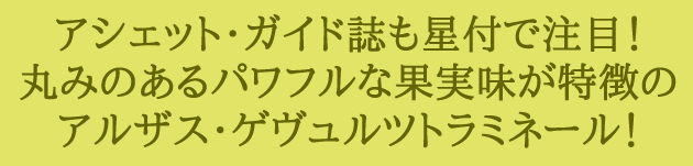 ![]() アルザス ゲヴュルツトラミネール 2021年 ドメーヌ・ウィリ・ギッセルブレッシュトゥ ライチやマンゴーといったトロピカルフルーツやバラの花のアロマ。 まろやかで丸みがあり、パワフルな果実味が特徴のやや辛口白ワイン。 |