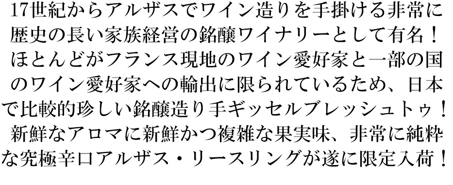 【商品説明】フランス アルザス辛口白ワイン愛好家大注目!アルザス・リースリング種100%ファン大注目!ワインスペクテーター誌大注目!フランスワイン権威評価本アシェット・ガイド誌大注目!リヨン国際コンクール金賞ゴールドメダル受賞酒!17世紀からアルザスでワイン造りを手掛ける非常に歴史の長い家族経営のワイナリー!ワイナリーの設立は1936年で、現オーナーで3代目!ストラスブールとコルマールの中間で、アルザスワイン街道の真ん中に位置するDambach la ville(ダンバッハ・ラ・ヴィル)とその周辺の最良の区画(最高品質の土壌)に18haのブドウ畑を所有!その一つには、グラン・クリュ畑のフランクシュタインが含まれ、家族が受け継いできた伝統的スタイルのもと最新技術を採り入れ、所有するブドウ畑の個性を最大限に表現するため、醗酵は低温管理され、ゆっくりと時間を掛けて行われます!毎年、数多くのコンクールでの受賞歴は、その品質の確かさを物語っています!この2023年のリースリングは、アルザスのブドウ品種の中でも最も気品のあるワインを生み出す品種らしい、辛口リースリングの見本とも言うべき、青リンゴやミント、ミネラルやグレープフルーツの新鮮なアロマに新鮮かつ複雑な果実味、非常に純粋な究極辛口アルザス・リースリングが限定で少量入荷!
