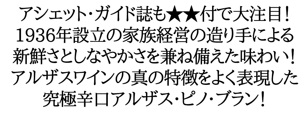 ![]() アルザス・ピノ・ブラン[2023]年 ぶどう品種:アルザス・ピノ・ブラン種100% 飲み頃温度:10℃~12℃ この[2018]年のピノ・ブランはミラベル (すもも)や白い花、ミネラルのアロマ! 新鮮さとしなやかさを兼ね備えた味わいがあり、 アルザスワインの真の特徴をよく表現した 究極辛口アルザス・ピノ・ブラン! |