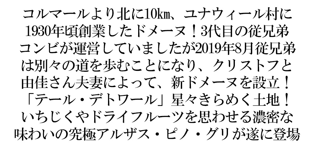 ![]() アルザス・ピノ・グリ[2022]年 「ビオディナミにしてから、鹿やイノシシが畑に入ってくるようになりました。それと、畑に野生のチューリップが咲いたり、野いちごが実るようになったんですよ」。「アルザスはぶどう品種のバラエティが豊かで、和食はもちろん、多種多様なお料理に合わせることができます。そのマリアージュの楽しさ、そして美味しさを、ひとりでも多くの方に知っていただければと思います」(由佳・ミットナット)。 料理との相性がとても興味深い、食通な方におすすめのワイン! ★由佳さんオススメ料理:肉系のパテ、キッシュ、ソース物の魚料理、豚、仔牛のロースト、インド料理(カレー)、モロッコ料理(クスクス、タジーヌ)、中華料理、チーズをベースにした料理、スパイスを利かせた料理、チーズ(コンテ、ボーフォー)究極アルザス・ピノ・グリが蔵出しで限定で少量入荷! ![]() ![]() |
