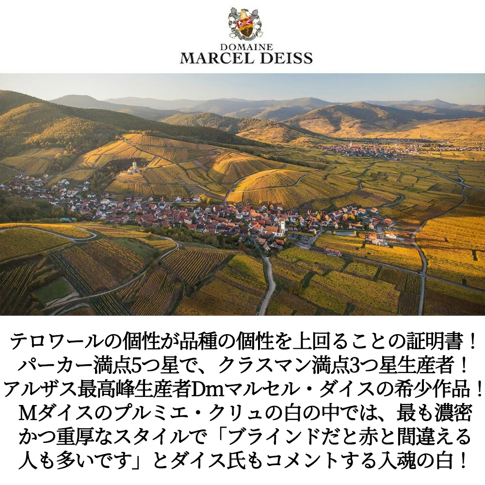 【商品説明】入手困難!大人気!高級アルザス辛口白ワイン愛好家大注目![2018]年ヴィンテージ!しかもダイス入魂の白!ダイス入魂のプルミエ・クリュ!しかも赤と間違える人も多いと言われる高級辛口白ワイン!造り手は、ロバート・パーカー満点★★★★★5つ星生産者であり(しかも“世界の最高級品と同等”のアルザス・ベストワインにマルセル・ダイスの5つのワインが選ばれています)このワインの2014VTがワインアドヴォケイト誌で90点の高評価!(今~2027年 )ゴーミヨ誌も5つ星を付け、クラスマンでは最高評価の★★★3つ星(トリプルスター・3つ星はマルセル・ダイスとヴァインバックとズィント・ウンブレヒトの3人だけ)!クラスマンをして「敬意を表すべきドメーヌ…“忘我の境”があなたに訪れるだろう」と言わしめ大絶賛させたドメーヌ・マルセル・ダイスの元詰!1.5ha!平均樹齢20年!それぞれ独立して植樹されたリースリング、ピノ・ノワール、ゲヴェルツトラミネールを3分の1ずつのブレンド!わずか10cm程度の砂礫質・花崗岩質の表土に、重厚な泥土質・粘土質の基層!「各品種の個性は感じられないでしょう?このワインは、テロワールの個性が品種の個性を上回ることの証明書でもあります」!ダイスのプルミエ・クリュの白の中では、もっとも濃密かつ重厚なスタイルで、「ブラインドだと赤と間違える人も多いです」(ジャン・ミッシェル・ダイス)!フランスの高級レストランのオンリストがとりわけ多い作品です!超限定輸入品が蔵出しで少量入荷!