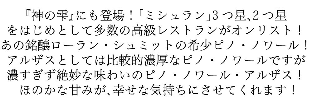 アルザス・ピノ・ノワール[2023]年 ■ぶどう品種:ピノノワール100% ■樹齢:平均樹齢30年 造り手はストラスブールの西、ベルグビエテン村に17世紀から続くアルザス最北部のグラン・クリュのひとつ「アルテンベルグ・ド・ベルグビエテン」の盟主として知られるドメーヌ・ローラン・シュミット! ワインのタイプはアルザスの中でもとりわけ繊細で、薫り高いことで知られ、料理を引き立てるタイプとして有名! ゴーミヨ誌には「繊細な彼らのワインは(アルザスワインの)真実を語っている。極めてデリケートで、力強いというよりも華やか。主張を押し付けるのではなく、それとなくほのめかすようである」と大絶賛! いちごやサクランボやフランボワーズにチョコレートを思わせるアロマ! アルザスとしては比較的濃厚なピノ・ノワールですが濃すぎず絶妙な味わいのピノノワール・アルザスで魚介類から肉料理、パスタなど、幅広い料理をより一層美味しくしてくれます。 ほのかな甘みが、幸せな気持ちにさせてくれます。