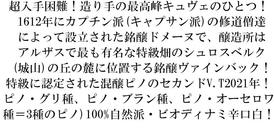 1612年にカプチン派修道僧により設立された歴史あるドメーヌで、1898年にファレール家の所有となりました。二代目にあたるテオ ファレール氏が亡くなった後、コレット夫人とその娘のカトリーヌとローランスが引き継ぎました。現在は長女のカトリーヌがドメーヌ運営を、息子であるテオ氏が栽培を担当しています。1998年から一部ビオディナミを導入し、2005年から全面実施しています。 所有面積は28.5ha。所有する代表的な畑は、グラン・クリュ・シュロスベルグ。1975年にアルザスで始めて認定されたグラン・クリュ畑で、総面積は80ha、その内ドメーヌ・ヴァインバックは8haと最大面積を所有しています。 カトリーヌは醸造学を学んだ後、1993年からこのドメーヌでワインメーカーを務めています。自然なブドウの味わいを生かすために、出来る限り介入を抑えるようにしています。手摘み収穫したブドウをゆっくり圧搾し、天然酵母を用い、アルザス伝統の1,500~6,000リットルのオーク古樽で発酵させます。 | ![]() ■ぶどう品種:ピノ種(ピノ・グリ種、ピノ・ブラン種、ピノ・オーセロワ種=3種のピノ)100% ■発酵・熟成:(通常より)小さな樽で14ヶ月間熟成 ■樹齢:樹齢は驚異の約40年 ■土壌:茶色い石灰質の小石や骨を含む排水性の良い土壌/ 泥灰土・石灰岩・砂岩から構成されるテロワール ■栽培:自然派・ビオデイナミ(デメテール認証&エコセール認証) ■地形:南南東、石灰質を好む地中海原産の植物で覆われた丘 ■気候:日当たり良 ■ 葡萄畑面積:8ha 超入手困難!高級アルザス・特級・混醸・ピノ自然派辛口白ワイン愛好家大注目! 造り手の最高峰グラン・クリュ・特級キュヴェのひとつ!造り手はロバート・パーカー満点5つ星★★★★★生産者であり、ゴーミヨ誌5つ星★★★★★生産者! 第三紀の礫岩によって覆われたジュラ紀中期ドッガー階の泥灰土・石灰岩・砂岩から構成されるテロワールです! この特級畑からは、熟成の有無に関わらず楽しめるワインが生まれます!若いうちはすでに、フルーティーな表現力を楽しめます!続いて数年の熟成後は、テロワールの特徴である寛容さが溶け込み、繊細な質感のワインになります! |
