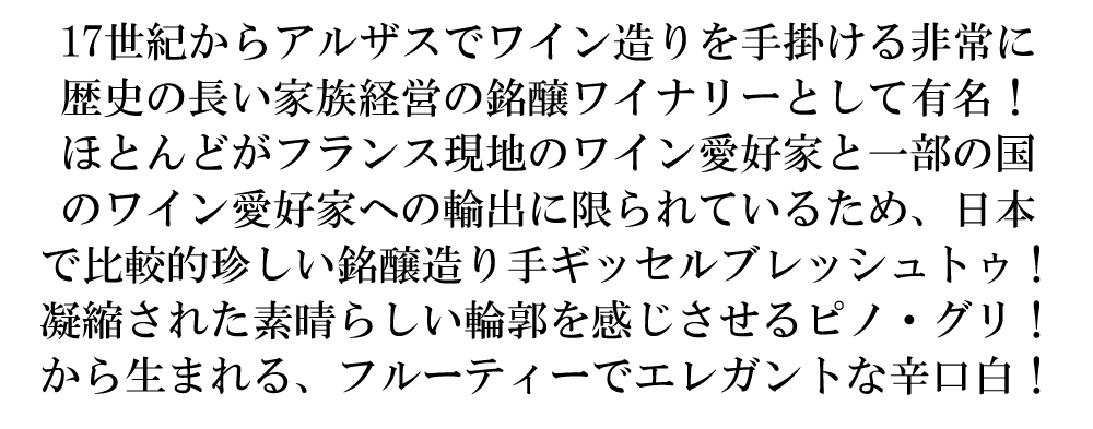 ヴィリー・ギッセルブレヒトは1936年に設立されたフランス・アルザス地方にある家族経営のワイナリーです。アルザスのダンバッハ・ラ・ヴィルの最も品質の高い土壌17haを所有し、アルザスワインやクレマンはもちろん、グランクリュ・フランクシュタインやグランクリュ・ミュンヒベルクも生産しています。 フランス・アルザス地方ダンバッハ・ラ・ヴィルに最高品質の土壌を17ha所有し、グラン・クリュ・フランクシュタインやグラン・クリュ・ミュンヒベルクも生産している家族経営の生産者。3世代に渡り受け継がれ作られてきた高品質なワインは世界中のワイン愛好家に愛されています。 | 17世紀からアルザスでワイン造りを手掛ける非常に