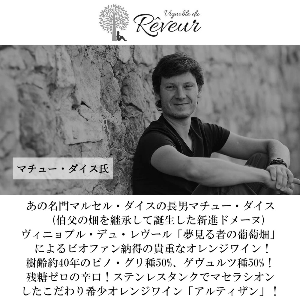 【商品説明】アルザス・オレンジワイン・辛口愛好家大注目!自然派ビオディナミ(デメテール認証&ユーロリーフ認証)のアルザス・オレンジワイン愛好家大注目!レストラン様からのリピート多数!あのマルセル・ダイスの長男マチュー・ダイスによるビオ・ファン納得のオレンジワイン!しかも残糖ゼロの最辛口! しかもダイスと言えばロバート・パーカー氏満点5つ星★★★★★生産者であり(しかも“世界の最高級品と同等”のアルザス・ベストワインにマルセル・ダイスの5つのワインが選ばれています)ゴーミヨ誌も5つ星を付け、クラスマンでは最高評価の★★★3つ星(トリプルスター・3つ星はマルセル・ダイスとヴァインバックとズィント・ウンブレヒトの3人だけ)クラスマンをして「敬意を表すべきドメーヌ…“忘我の境”があなたに訪れるだろう」と言わしめ大絶賛させた大人気ドメーヌ! その「ドメーヌ・マルセル・ダイス」の現当主ジャン・ミッシェル・ダイスの長男で、2007年より同ドメーヌの醸造を担当しているマチュー・ダイスが、伯父(実母クラリス・ミシュレの兄カシアン)の畑を継承して誕生したドメーヌです!カシアン・ミシュレも1999年からビオロジー栽培を実践していましたが、2012年のマチューの継承と同時にビオディナミに転換し、厳しい収量制限なども含めて「ダイス流」の栽培が開始されました!醸造を「マルセル・ダイス」の醸造所で行うようになった2013年が事実上のファーストヴィンテージで、新ドメーヌ名「ヴィニョブル・デュ・レヴール(「夢見る者のぶどう畑」)」のラベルにて、2015年に発売が開始されました! 「マルセル・ダイスのワインはテロワールのワインであり、長期熟成型のグラン・ヴァンです。対してヴィニョブル・デュ・レヴールのワインは、より若いうちから楽しまれることをイメージして造っています。また、新ドメーヌでは「自由と革新」をキーワードに、これまでアルザスでは行われていなかった醸造法なども積極的に取り入れていきます。例えば今回「サンギュリエ」に採用したマセラシオン・カルボニックがそうですし、アンフォラによる醸造も行う予定です。ぜひ楽しみにしていてください」(マチュー・ダイス)! このアルティザン[2023]年(アルザス・オレンジワイン)セックは、ピノ・グリ種50%、ゲヴュルツトラミネール種50%。ベンウィール村のわずか0.5haの畑より!沖積土壌!樹齢約40年!残糖ゼロの辛口!ステンレスタンクでマセラシオンした、オレンジワインです! 作品名の「アルティザン」は「職人」という意味で、職人が作る芸術作品に見られる「ざらざら感」や「ごつごつ感」といった風合いがオレンジ・ワインのテクスチャーを想起させることと、特殊な醸造法であるため、自然の解釈としてのワイン造りにおいて職人が重要な役割を果たしていることを表現したものです。(マチュー・ダイス)!もちろん現地のセラー数ヶ月前の蔵出し品の正規品で限定少量入荷!