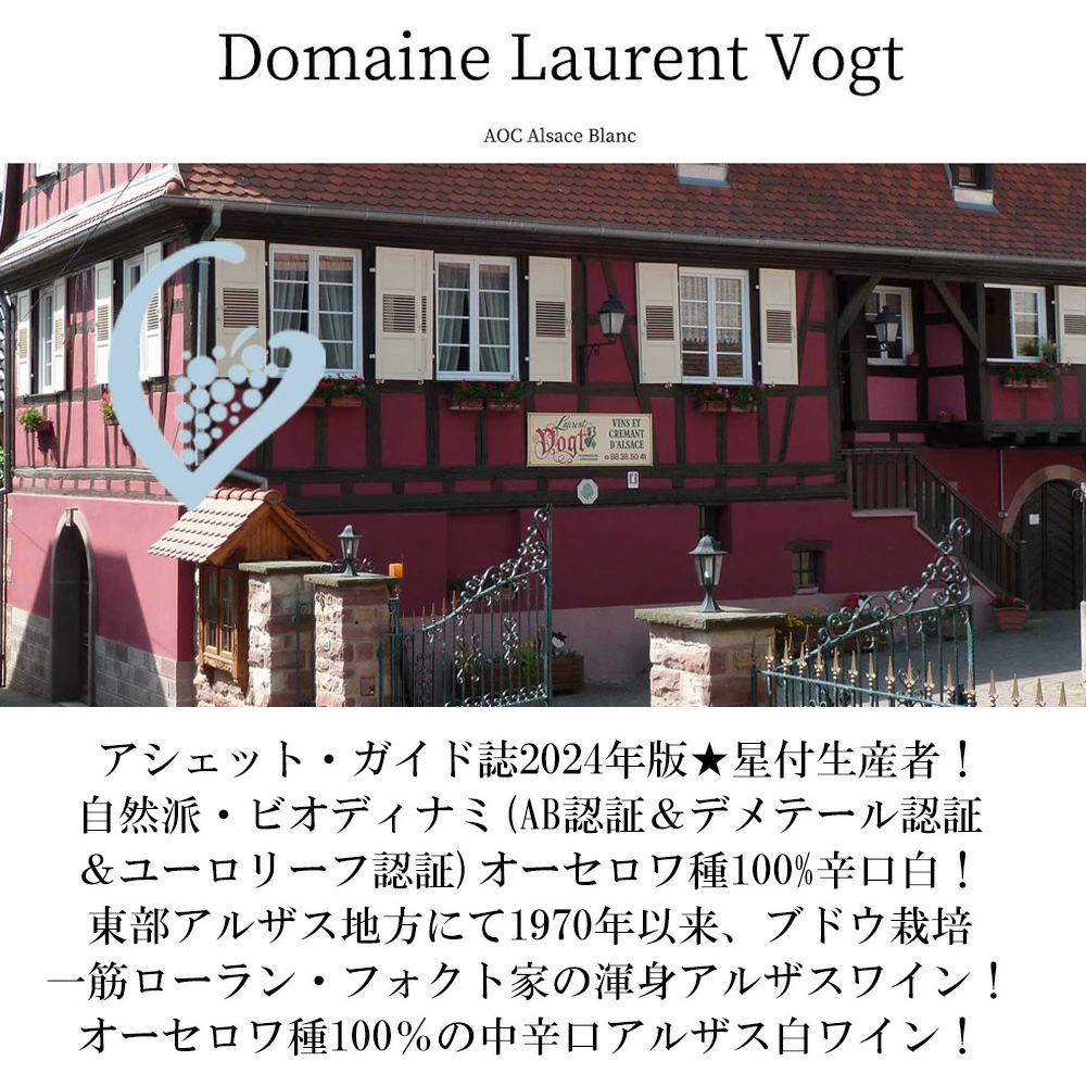 【商品名】アルザス・オーセロワ[2023]年・ドメーヌ・ローラン・ヴォグト元詰・オーセロワ種100%・自然派・ビオディナミ(AB認証&デメテール認証&ユーロリーフ認証)・木樽熟成・AOCアルザス・オーセロワ・(残糖4.3g/l、酸度5.10g)・やや辛口・白・アシェット・ガイド誌2024年版★付生産者