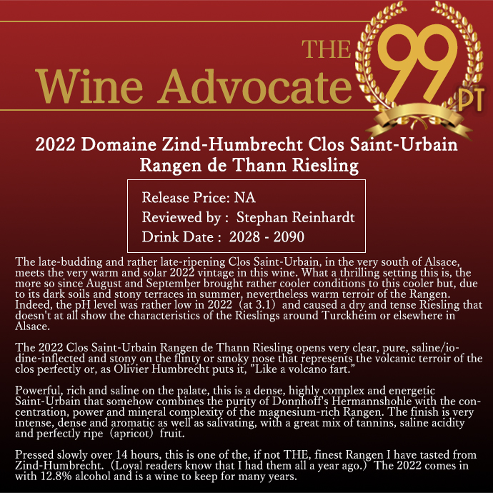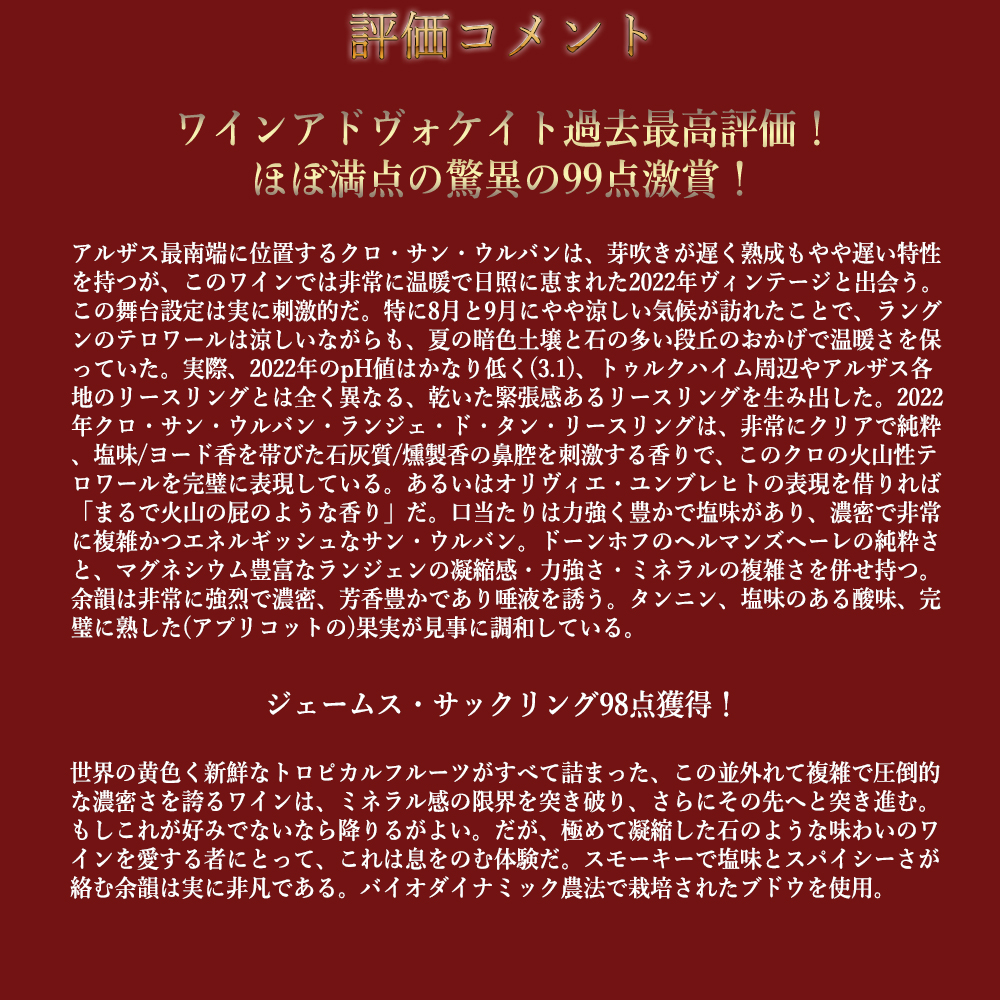【商品説明】超入手困難!アルザス辛口白ワイン愛好家垂涎!究極高級コレクターアイテム!アルザス・リースリングの最高峰のひとつ!グラン・クリュ100%のリースリング種100%! しかも造り手は、ベタンヌ&ドゥソーヴ2022年版で、マルセル・ダイスとともに満点5つ星★★★★★生産者であり、R.パーカー満点5つ星生産者!ベタンヌ&ドゥソーヴも「レオナール・ウンブレヒトは、60~70年代にかけてアルザスのグラン・ヴァン造りに革命を巻き起こした。収量を厳しくコントロールし、偉大なテロワールを開墾し、そうすることでドメーヌを世界でも最高の生産者の1つに引き上げた。その息子オリヴィエが引き継ぎ、ワインの品質を向上させ続けている。オリヴィエは今日、その熟練の技で頂点に君臨する。テロワールが品種に優越するこれらのキュヴェが可能にしてくれた、料理とワインの合わせやすさを絶賛することだろう」と絶賛! ニール・ベケットの「死ぬ前に飲むべき1001ワイン」にも2銘柄が登場!「オリヴィエ・ウンブレヒトは根っからのワイン醸造家であり、この職業の技術的奥義に一歩踏み込んだ人物であり、マスターオブワイン協会の試験に初めて通ったフランス人である。彼は1959年に設立されたズィント・ウンブレヒトのワイナリーをアルザスの生産者の有利な位置につけることに尽力した」とこれまた大絶賛! この2022年のランゲン・ド・タン・クロ・サンテュルバン・グラン・クリュ・リースリングで、ワインアドヴォケイト過去最高評価!ほぼ満点の驚異の99点激賞でコメントは『アルザス最南端に位置するクロ・サン・ウルバンは、芽吹きが遅く熟成もやや遅い特性を持つが、このワインでは非常に温暖で日照に恵まれた2022年ヴィンテージと出会う。この舞台設定は実に刺激的だ。特に8月と9月にやや涼しい気候が訪れたことで、ラングンのテロワールは涼しいながらも、夏の暗色土壌と石の多い段丘のおかげで温暖さを保っていた。実際、2022年のpH値はかなり低く(3.1)、トゥルクハイム周辺やアルザス各地のリースリングとは全く異なる、乾いた緊張感あるリースリングを生み出した。2022年クロ・サン・ウルバン・ランジェ・ド・タン・リースリングは、非常にクリアで純粋、塩味/ヨード香を帯びた石灰質/燻製香の鼻腔を刺激する香りで、このクロの火山性テロワールを完璧に表現している。あるいはオリヴィエ・ユンブレヒトの表現を借りれば「まるで火山の屁のような香り」だ。口当たりは力強く豊かで塩味があり、濃密で非常に複雑かつエネルギッシュなサン・ウルバン。ドーンホフのヘルマンズヘーレの純粋さと、マグネシウム豊富なランジェンの凝縮感・力強さ・ミネラルの複雑さを併せ持つ。余韻は非常に強烈で濃密、芳香豊かであり唾液を誘う。タンニン、塩味のある酸味、完璧に熟した(アプリコットの)果実が見事に調和している。』と高評価! ジェームス・サックリング98点でコメントは『世界の黄色く新鮮なトロピカルフルーツがすべて詰まった、この並外れて複雑で圧倒的な濃密さを誇るワインは、ミネラル感の限界を突き破り、さらにその先へと突き進む。もしこれが好みでないなら降りるがよい。だが、極めて凝縮した石のような味わいのワインを愛する者にとって、これは息をのむ体験だ。スモーキーで塩味とスパイシーさが絡む余韻は実に非凡である。バイオダイナミック農法で栽培されたブドウを使用。』! ヴィノス誌97点でコメントは『2022年リースリング・ランゲン・ド・タン・クロ・サンテュルバン・グラン・クリュは、リースリングの中でも最も遅く収穫されたもののひとつでありながら、アルコール度数は12.8%と最も低い部類に入る。鮮烈な鋭さを持つ緑の香りは、クレソンのような強烈さを感じさせ、未熟さを感じさせないフレッシュで緑豊かで力強い香りが、最初の香りのハイライトを形作る。名高いスモーキーな香りは二度目に鼻をくすぐり、続いて見事なほど芳醇なタンジェリンの香りが広がる。口当たりは絶妙な精度を誇り、石のような硬質感と張り、そして素朴な裸の味わいが、驚くほど繊細なニュアンスと圧倒的な柑橘の輝きを伴っている。これは、活き活きとした柑橘の風味と石のような直截さ、そして輝きに満ちた驚異の逸品である。』! ワインスペクテーター94点でコメントは『塩気と酵母の風味が乾燥アプリコット、グアバ、リンゴの味わいに溶け込み、重厚で表現力豊かな仕上がり。底流する圧倒的な深みと力強さが、熟成に値する一本であることを物語る。長い余韻にはすりおろした生姜と乾燥タイムの香りがほのかに漂う。彫刻のように鋭く、重厚でありながら、まだ緊密に凝縮された状態。熟成を要する。』と大注目! アルザス最南端、タンの村にあるグラン・クリュ、ランゲンのクロ・サンテュルバン畑(15世紀末頃に建てられたサンテュルバンに由来する小さな教会の名)!デボン紀・石灰紀の火山性岩と堆積性砂岩を含む貧しい土壌で、真南向きで急勾配