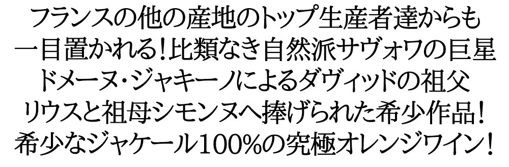 マリウス&シモーヌ[2019]年 ■ぶどう品種:ジャケール種100% 造り手のドメーヌ・ジャキーノは、南サヴォワで数世紀にわたって農業を営み、1988年にフレデリック・ジャキーノの代でぶどう専業となり、2006年には栽培、醸造の長い修業を終えた弟のダヴィッドがドメーヌに入り、ビオロジーを開始! 2010年からすべての畑がビオディナミに!2017年にはデメテール認定を獲得!フランスの他の産地のトップ生産者達からも一目置かれる、比類なき自然派サヴォワの巨星ドメーヌ・ジャキーノによるダヴィッドの祖父マリウスと祖母シモンヌへ捧げられた作品! 希少なジャケール100%のオレンジワイン!このマリウス&シモーヌは、粘土石灰質土壌の平均樹齢30年!50%を樽で、50%をアンフォラで30日間マセラシオン(&アルコール発酵)させたオレンジワイン!樽でマロラクティック発酵&10ヶ月間シュール・リー熟成!SO2不使用で造られる究極ヴァン・ド・フランスの希少オレンジワイン!