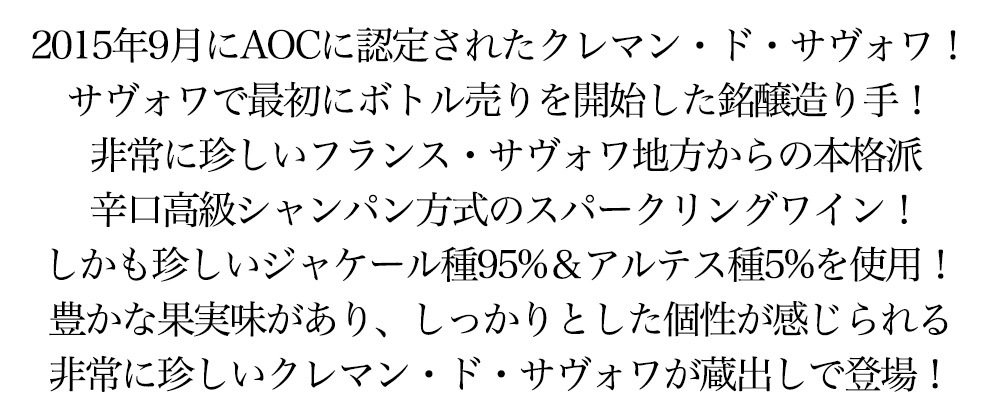 ![]() クレマン ド サヴォワ ■葡萄品種:ジャケール種85% シャルドネ種15% 非常に珍しいフランス・サヴォワ地方からの本格派辛口高級シャンパン方式スパークリングワイン。 ジャケール種と言えば、サヴォワ地方の土着品種で色も酸味も果実味も共に控えめで日本の甲州のようなくせのない淡い品種として人気です。 造り手は1853年、カセラン・ペリエ氏が、サンタンドレ・レ・マルシェにセラーを購入しモン・グラニエの山の麓で葡萄栽培を開始!その後、引き継いだ息子のクロード=エミリー・ペリエ氏は新たにセラーを購入し、フィロキセラ禍で失われた葡萄畑を再開!葡萄栽培者であり営業でもあった彼は、造ったワインを騾馬にひかせてカフェの店主たちへと売り歩いきました。 手摘みで収穫し、さらに人の手で厳しく選別し、注意深くゆっくりとプレスします!ベースワインを発酵させた後、瓶内二次発酵を行います!最低12ヶ月以上熟成させています!豊かな果実味があり、しっかりとした個性が感じられる非常に珍しいクレマン・ド・サヴォワが蔵出しで限定少量入荷! |