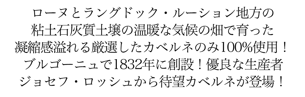 【商品説明】南フランス愛好家大注目!カベルネファン大注目!カベルネソーヴィニヨンは、世界で最も栽培されている黒ブドウの代表品種で原産地はボルドー地方と言われています!ジョセフ・ロッシュは南仏の粘土石灰質土壌の温暖な気候で育った凝縮感溢れるカベルネだけをテンレスタンクで発酵・熟成で醸造しました!造り手はコート・ドールの中心ニュイ・サン・ジョルジュ本拠地でブルゴーニュで培われた伝統と新しい技術の融合を図るジョセフ・ロッシュはブルゴーニュで1832年に創設された歴史ある優良な生産者であり、指折りの規模と高品質を兼ね備えたネゴシアンでもあります!100軒あまりの契約栽培農家や醸造所に対し、5人の専属醸造技術者がきめ細かな技術指導や機材援助などを行い、毎年安定した高品質のワインを世界各地に送り出しています!このワイン、ジョセフ・ロッシュ・カベルネ・ソーヴィニヨン[2023]年は、艶のある赤紫色で、熟した果実や野生的なカシス香と茎やほんの少し青い野菜を思わせる清潔感のある香りが広がり、口に含むと舌の上に残る程良い渋味とドライな味わいが特徴!極旨ヴァン・ド・フランスが限定入荷!