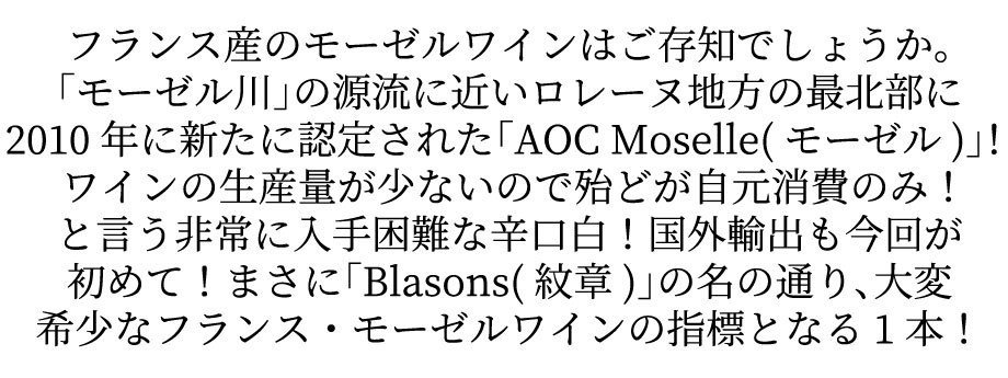 ![]() モーゼル ブラン キュヴェ レ ブラゾン 2019 蔵出し品 ドメーヌ ソンターク元詰 AOCモーゼル ブラン 自然派 サステイナブル農法 ■ぶどう品種:オーセロワ種50%/ピノ・グリ種30%/ミュラー・トゥルガウ種20% フランス産モーゼル辛口白ワイン愛好家大注目! ロレーヌ地方の最北部に2010年に新たに認定された「AOC Moselle(モーゼル)」がこのフランス産モーゼルワイン! 国外輸出は今回が初めて!まさに「Blasons(紋章)」の名の通り、大変希少なフランス・モーゼルワインの指標となる1本です! 2007年よりクロード・ソンターク氏が当主となりドメーヌとしてワイン造りを開始。畑は減農薬で5haを所有。「フランス・モーゼルのワインは生産量が少ないので殆どが自元消費のみです。是非希少なモーゼルワインを味わってほしい」とクロード氏。 「ワインはキッシュ・ロレーヌやベッコフ、シュークルートなどの料理と合わせると、とても美味しい。チーズならばブリーチーズがお勧め。日本料理ならば、きっと天ぷらや寿司に合うと思う」とクロード氏よりコメント |
