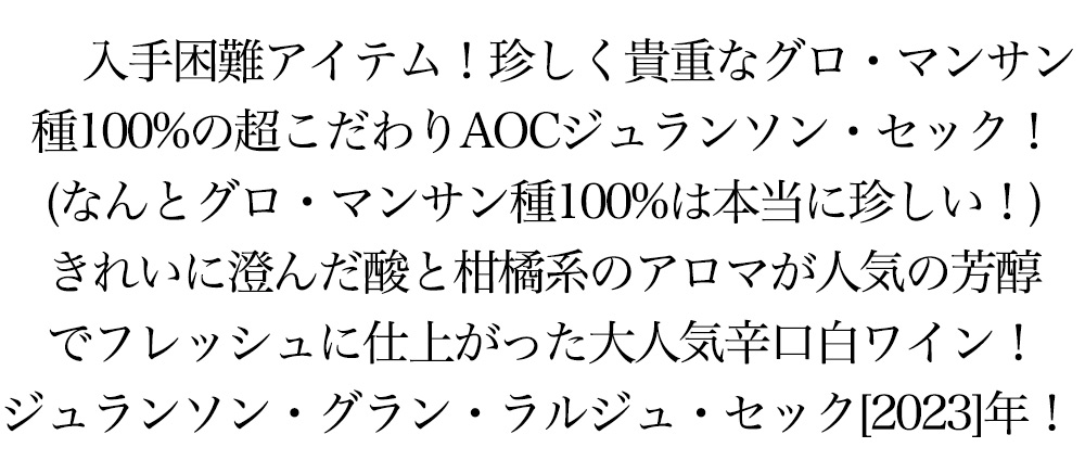 ジュランソン グラン ラルジュ セック 2023 蔵出し品 カーヴ ド ガン元詰 グロ マンサン種100% AOCジュランソン セック 白 辛口